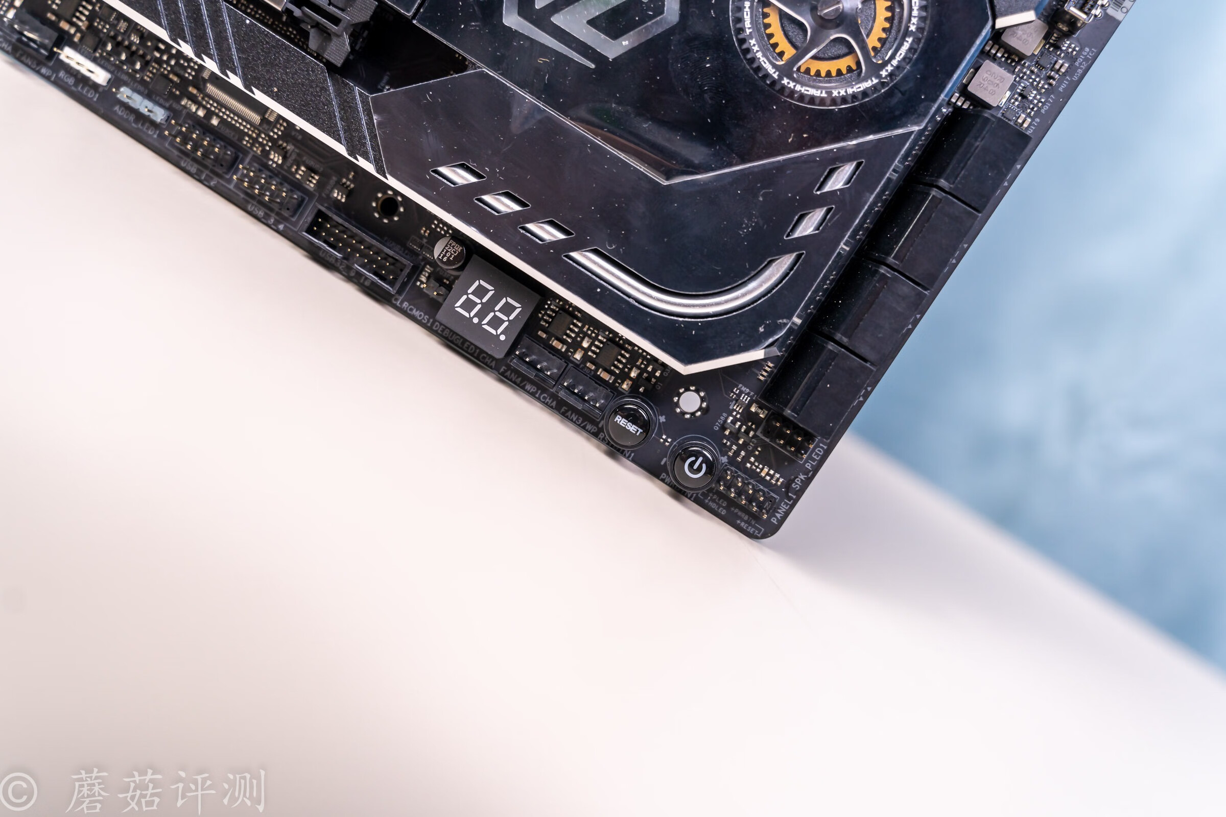 ▼右侧还有很多IO接口,从左到右依次是BIOS清除跳线插座,故障代码指示屏,两个4Pin的风扇供电插座,重启按键、开机按键,机箱跳线插座,上面还有一个主板扬声器插座。