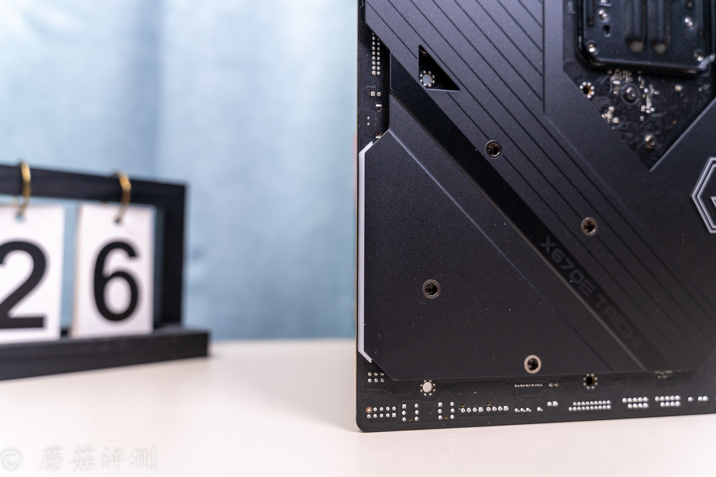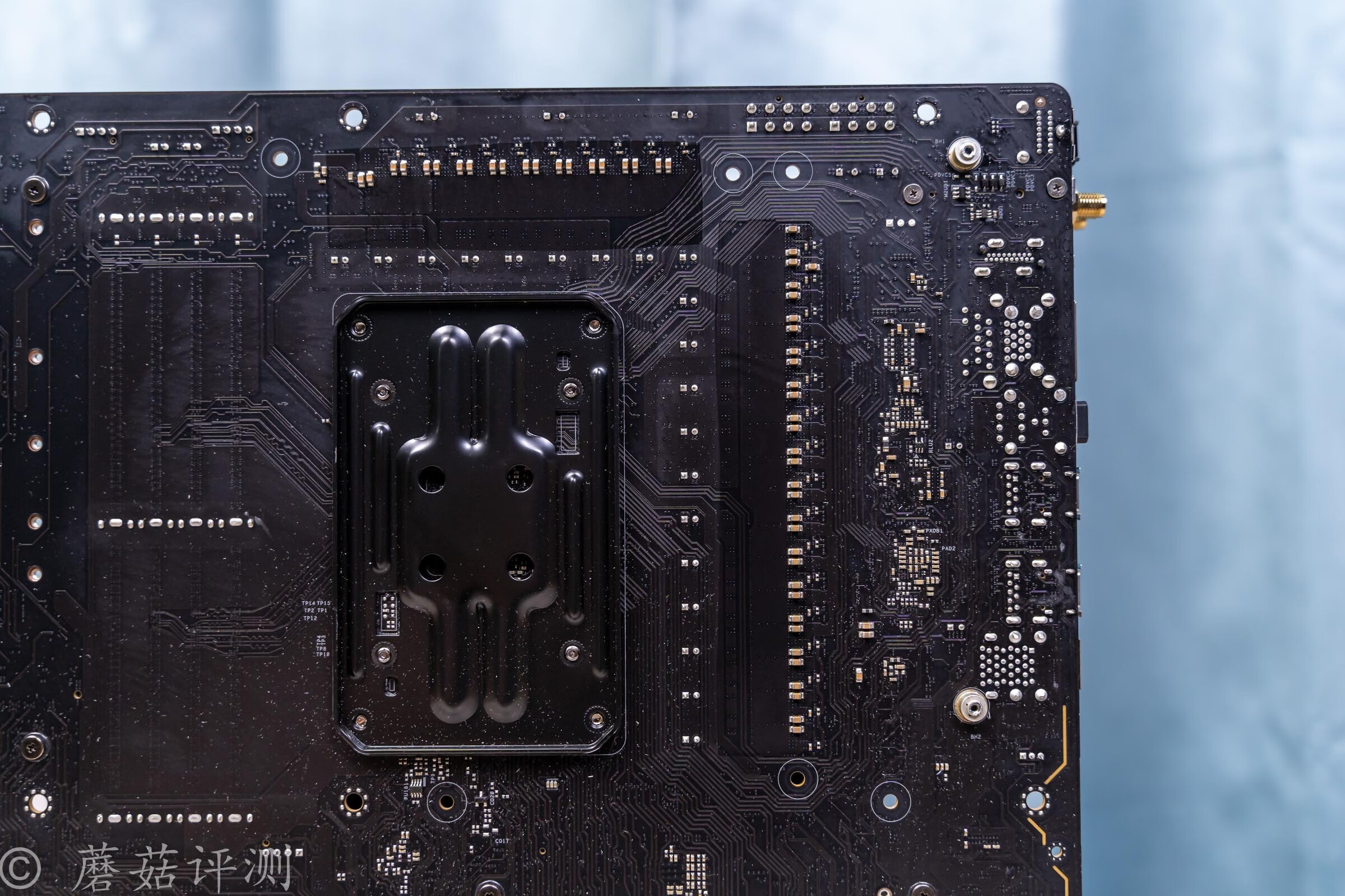 ▼主板的金属背板部分,在供电模组的后部有导热垫,其余部分贴有绝缘塑料贴,右下角还有柔光灯板,细节做工、处理的不错。
