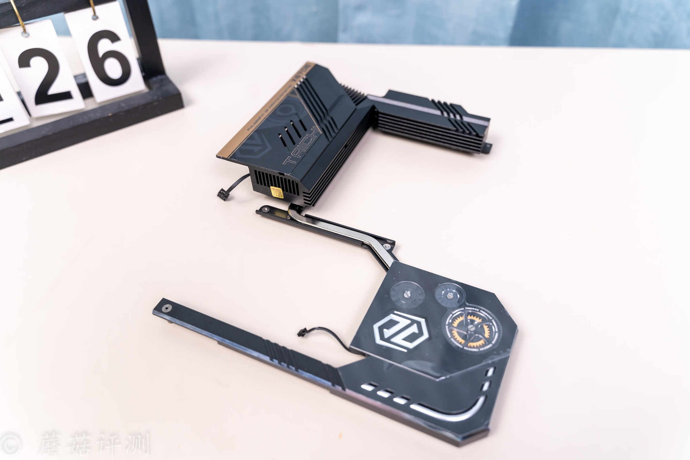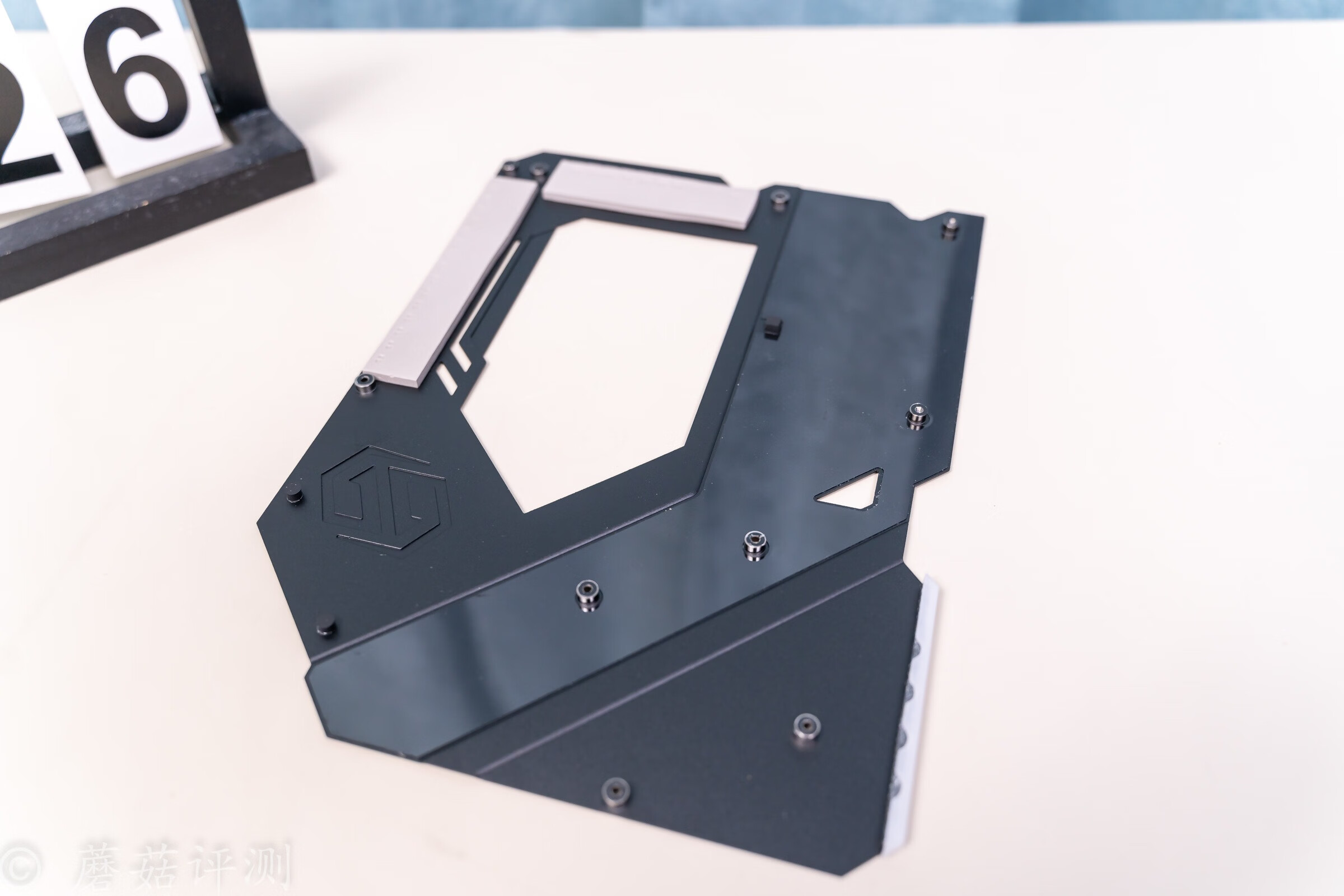 ▼金属背板的做工非常不错,表面有复杂的表面处理,左下角还有一个太极LOGO,这个LOGO是冲压处理的,质感很不错。