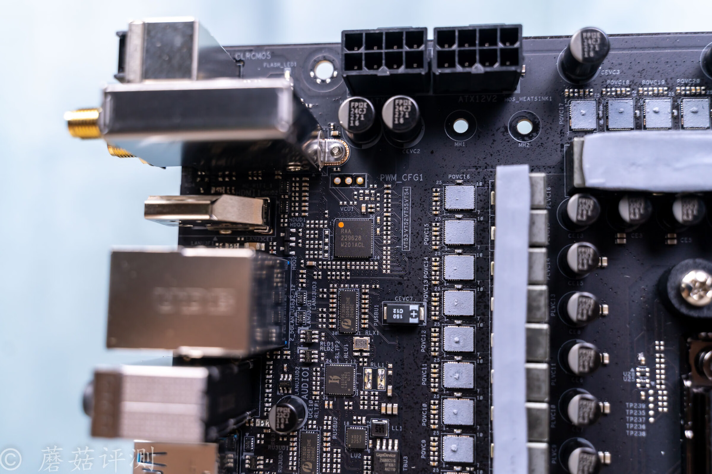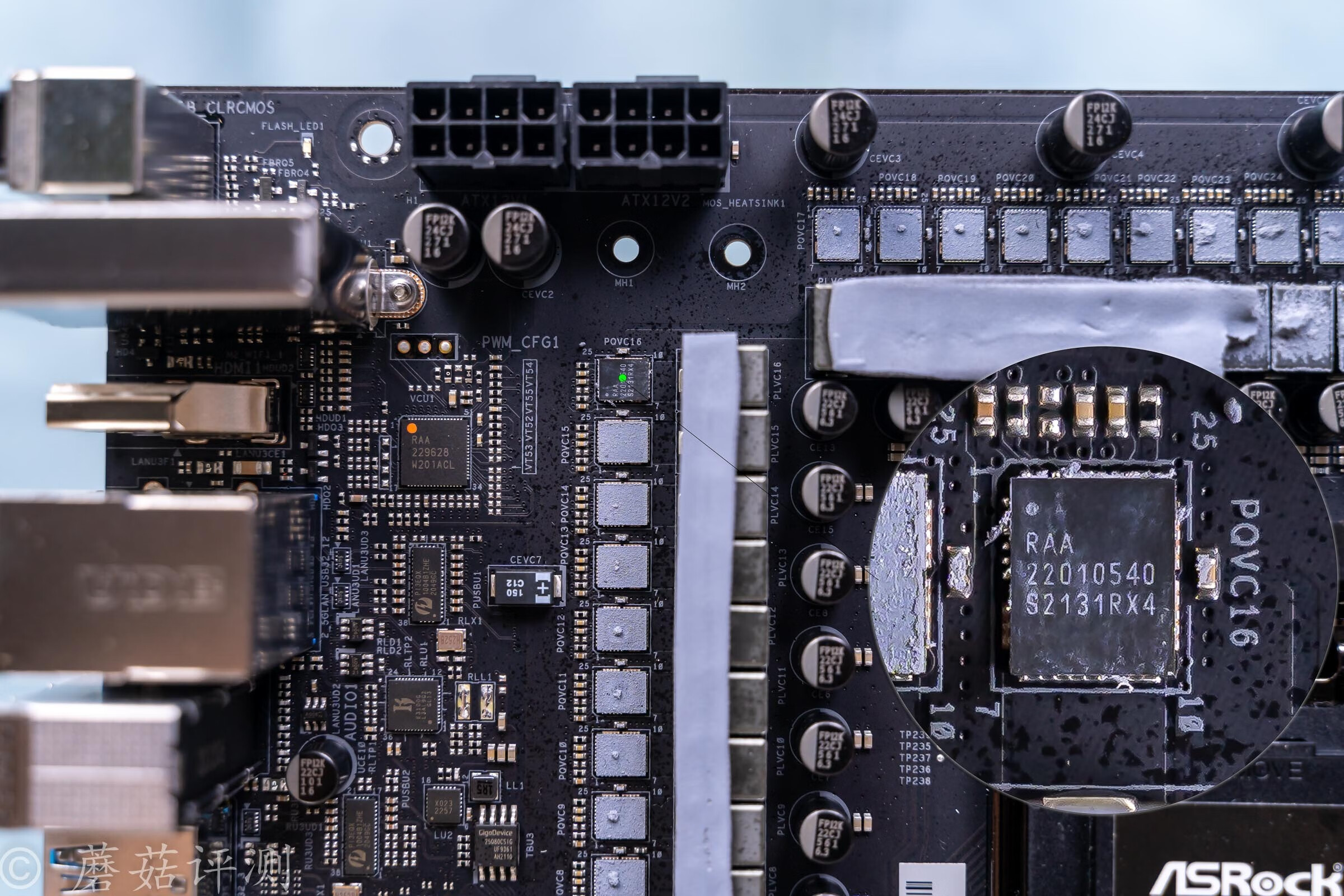 ▼供电插座的下面,是供电电路的PWM主控,瑞萨出品,丝印RAA229628。这个PWM主控是新款,没有相关的任何信息,但是从这块主板的供电配置来看,这里应该是运行在12+2共14相PWM信号输出,其中12相PWM控制信号每相进两颗DrMos,采用一种超级并联的供电设计。