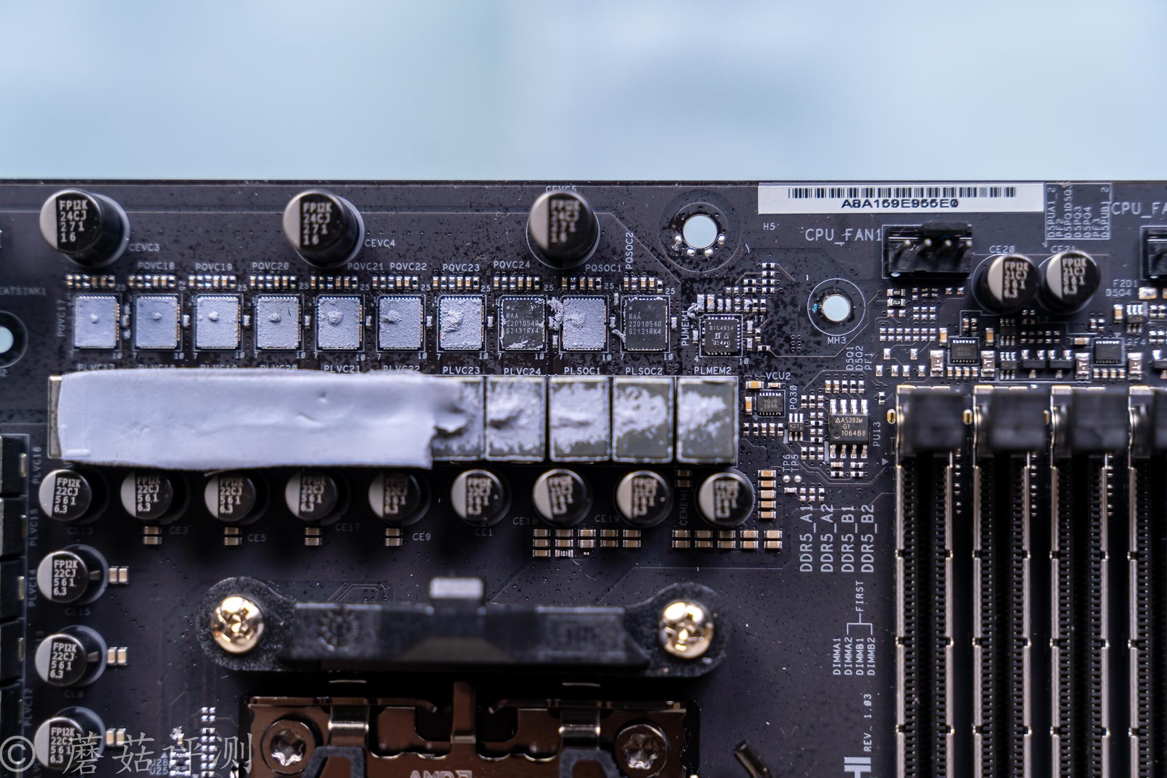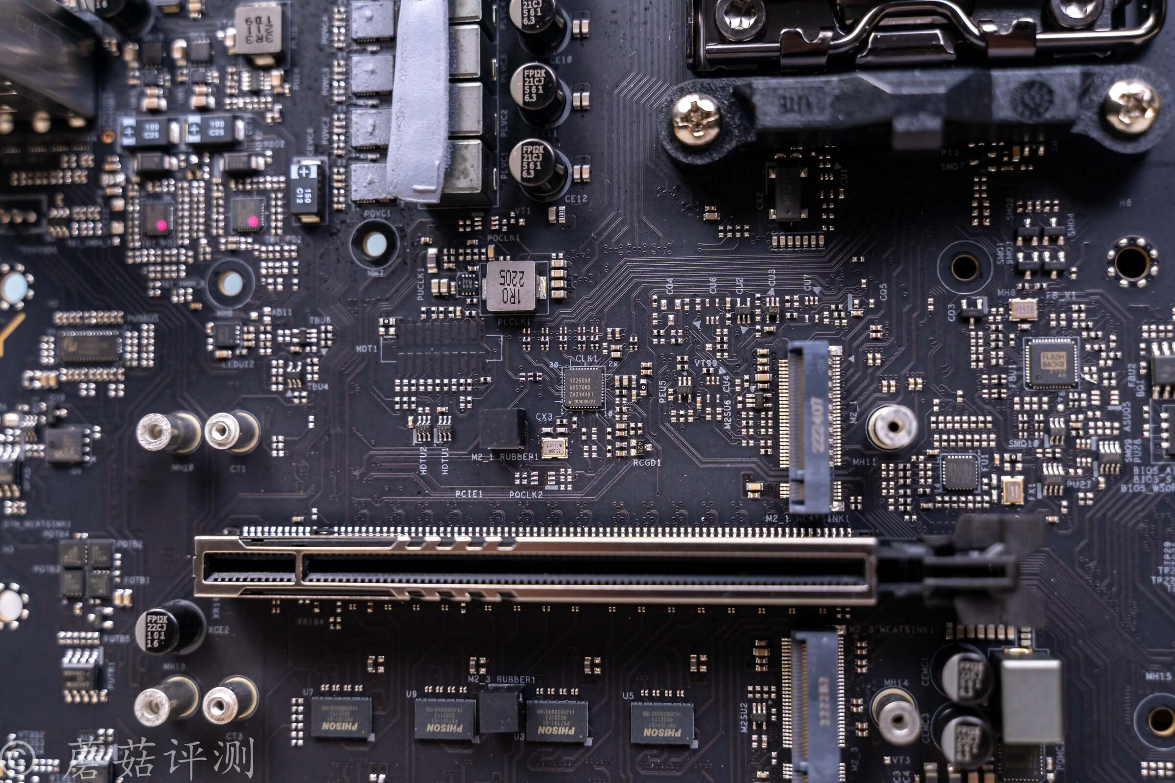 ▼主板的下部配有两条全长的PCIe5.0插槽,上面是X16的,下面的貌似是X8的。两条PCIe5.0插槽之间,有8颗群联的PCIe5.0 Redriver IC,用于给主板拆分PCIe5.0接口提供支持。