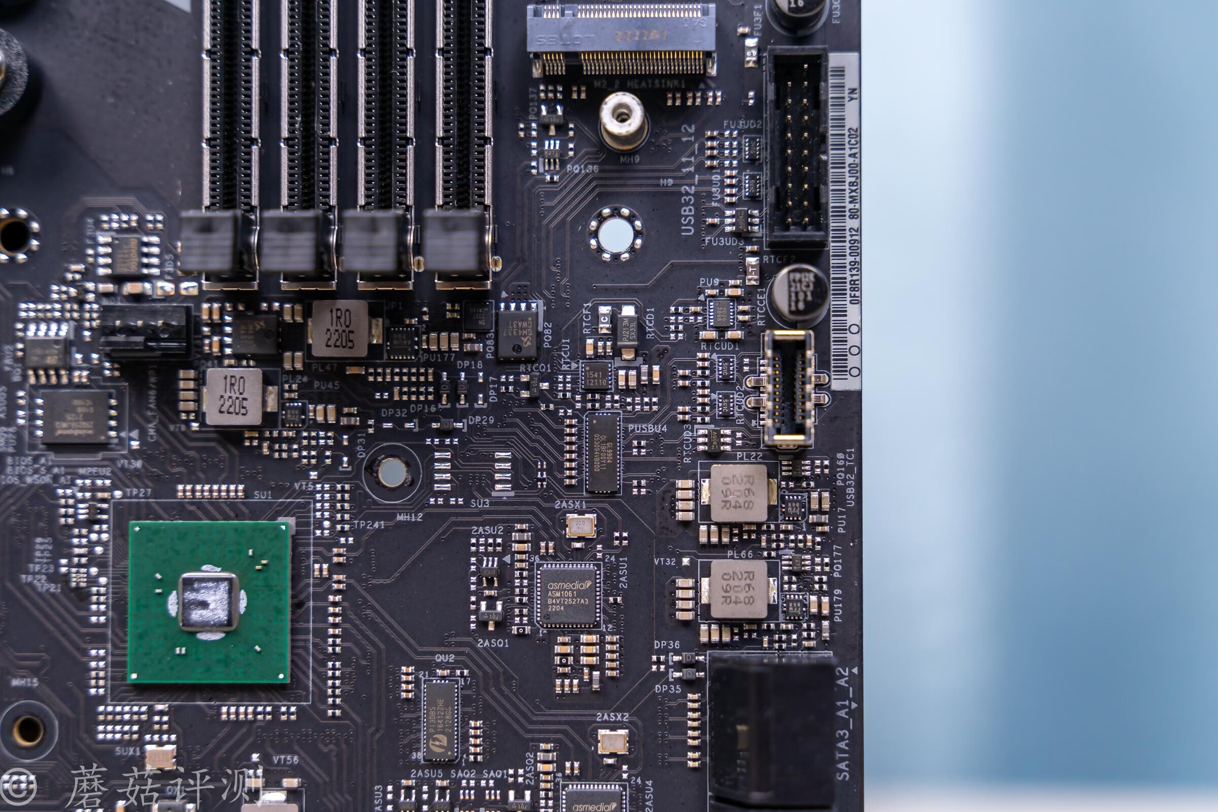 ▼南桥芯片的右侧,有三颗芯片,绿色的是PCIe信号桥接芯片,红色的两颗丝印ASM1061,这是一颗PCIe转SATA的主控芯片,每颗负责四个SATA3.0接口,给主板右下角的八个SATA3.0接口提供支持。