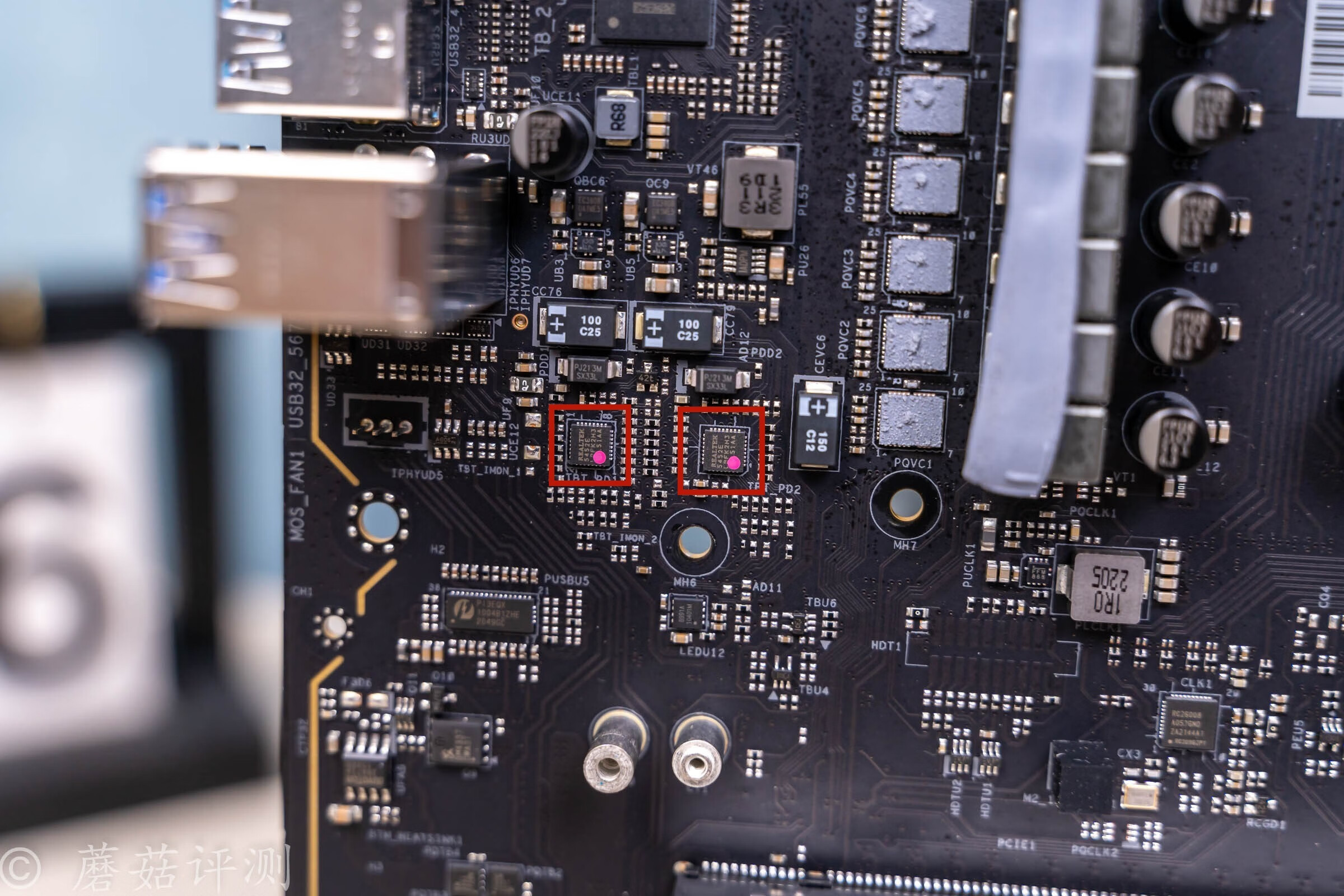 ▼下面还有两颗一模一样的芯片,丝印REALTEK 5452E,这是Type-C接口的PD供电公职器,给后部的USB4接口提供最大27W的PD供电支持。
