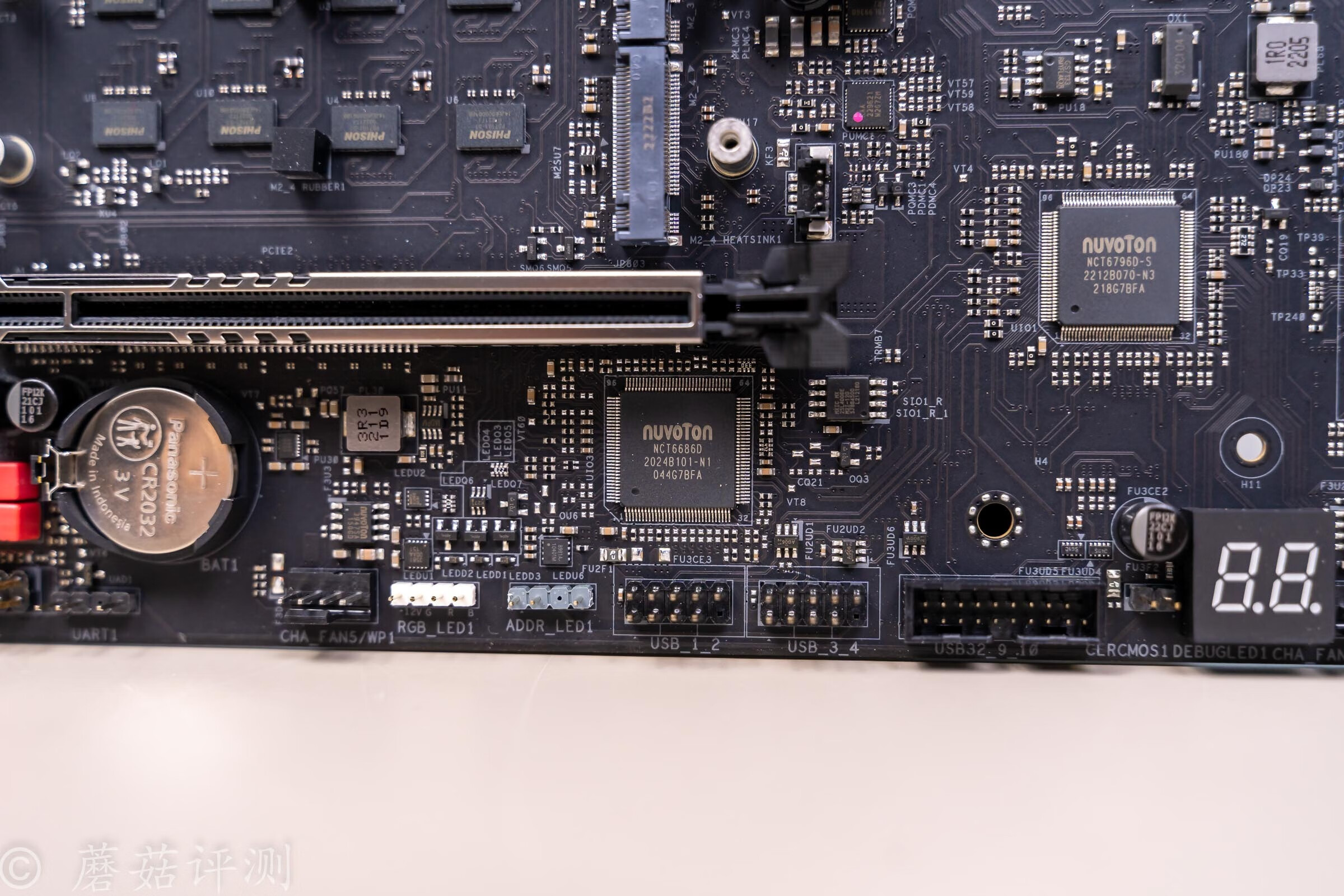▼最下面的PCIe插槽的右下角,还有一颗NCT6686D,也是一颗监控芯片,用于检测主板的各项参数。
