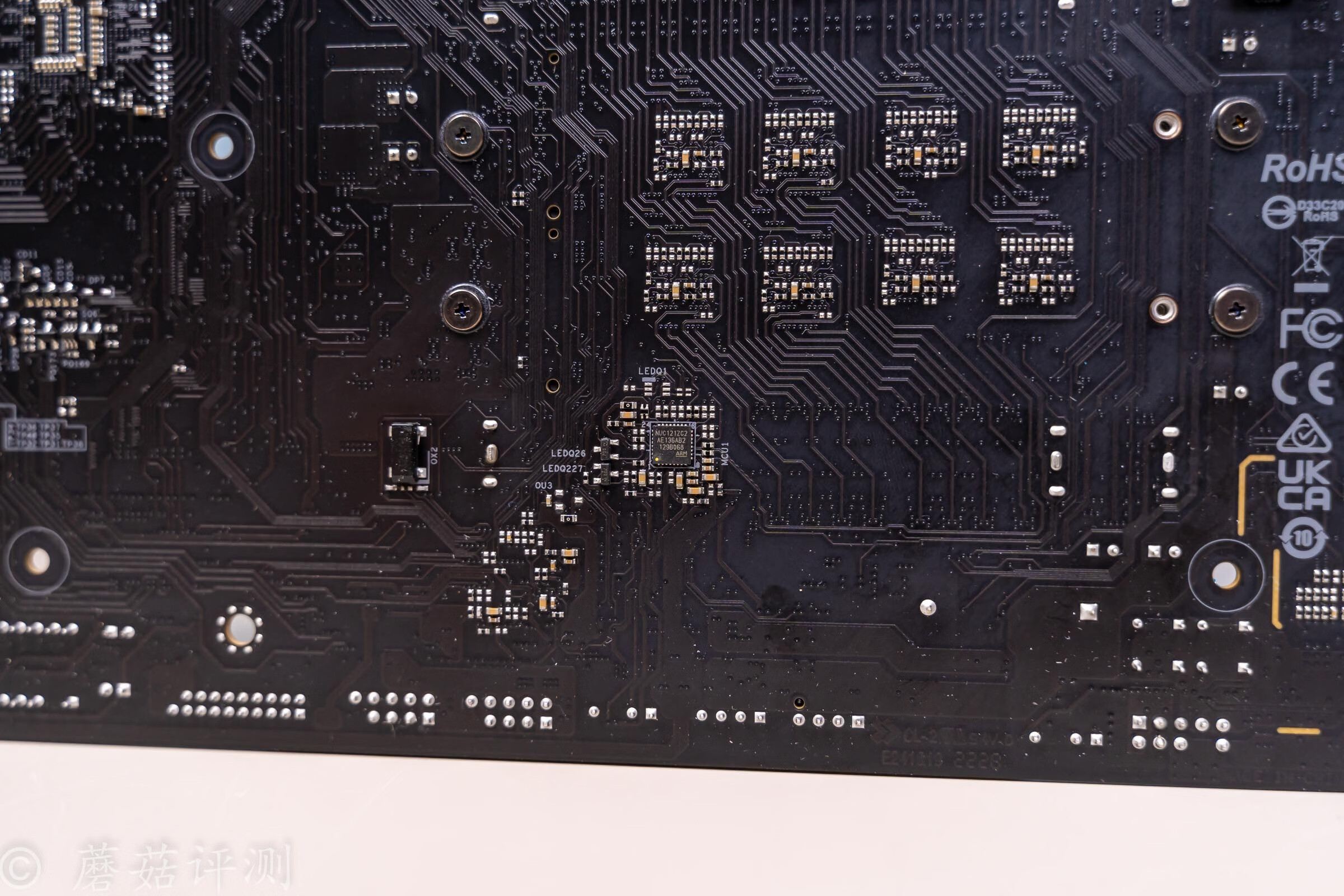 ▼另外,主板的中下部还有一颗芯片,丝印NUC121ZC2,这是一颗ARM架构的主控芯片,用于给主板的RGB灯效提供支持。