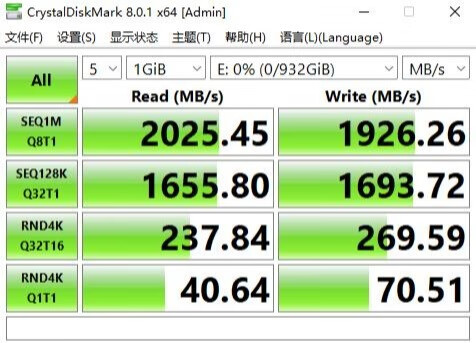 ▼跑一个完整的测试,顺序读取速度2025MB/s、写入1926MB/s,4K读取40MB/s、写入70MB/s,整体的速度表现非常不错,可以轻松的满足日常使用需求。另外这个4K的速度表现,平时在硬盘盒内安装软件,也没啥问题,可以流畅运行。