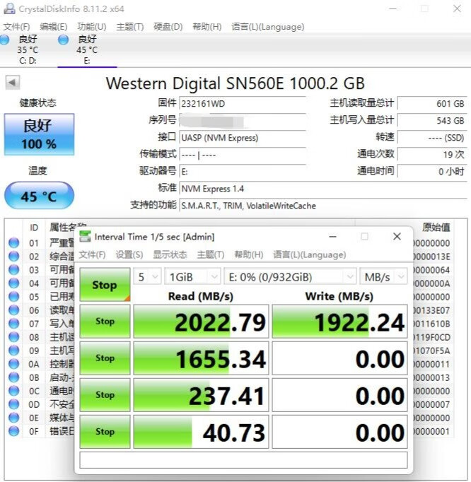 ▼这里使用主板后置的20Gbps带宽的Type-C接口连接移动固态硬盘,测试下传输速度。先测试下顺序读取和写入速度,传输速度表现非常不错,在2000MB/s左右波动。