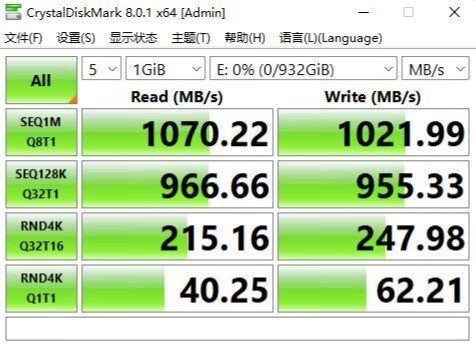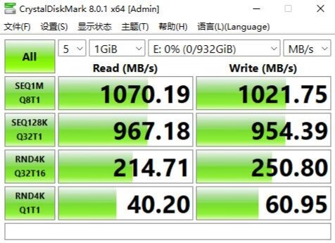 ▼跑一个完整的测试,顺序读取速度1070MB/s、写入1021MB/s,4K读取速度40MB/s、写入速度60MB/s,整体的性能表现也还不错,顺序读写速度相比较20Gbps带宽的Type-C接口有明显的下降,4K读写速度方面,略有下降。