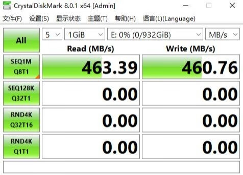 ▼顺序读取和写入速度方面,最大只能去到460MB/s左右了,又下降了一半左右。