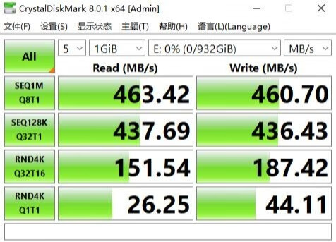 ▼跑一个完整的测试,顺序读写速度方面,稳定在460MB/s左右。4K读写速度方面,相比较于10Gbps带宽的USB接口,速度也略有下降。