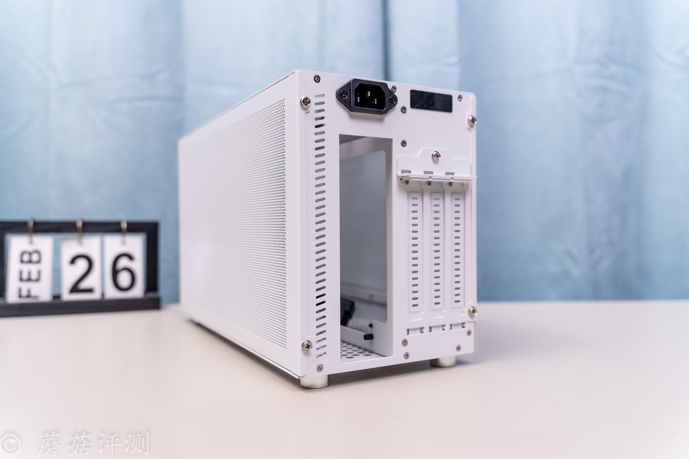 ▼机箱尾部,熟悉的主板和显卡背靠背的设计,顶部是电源接口。