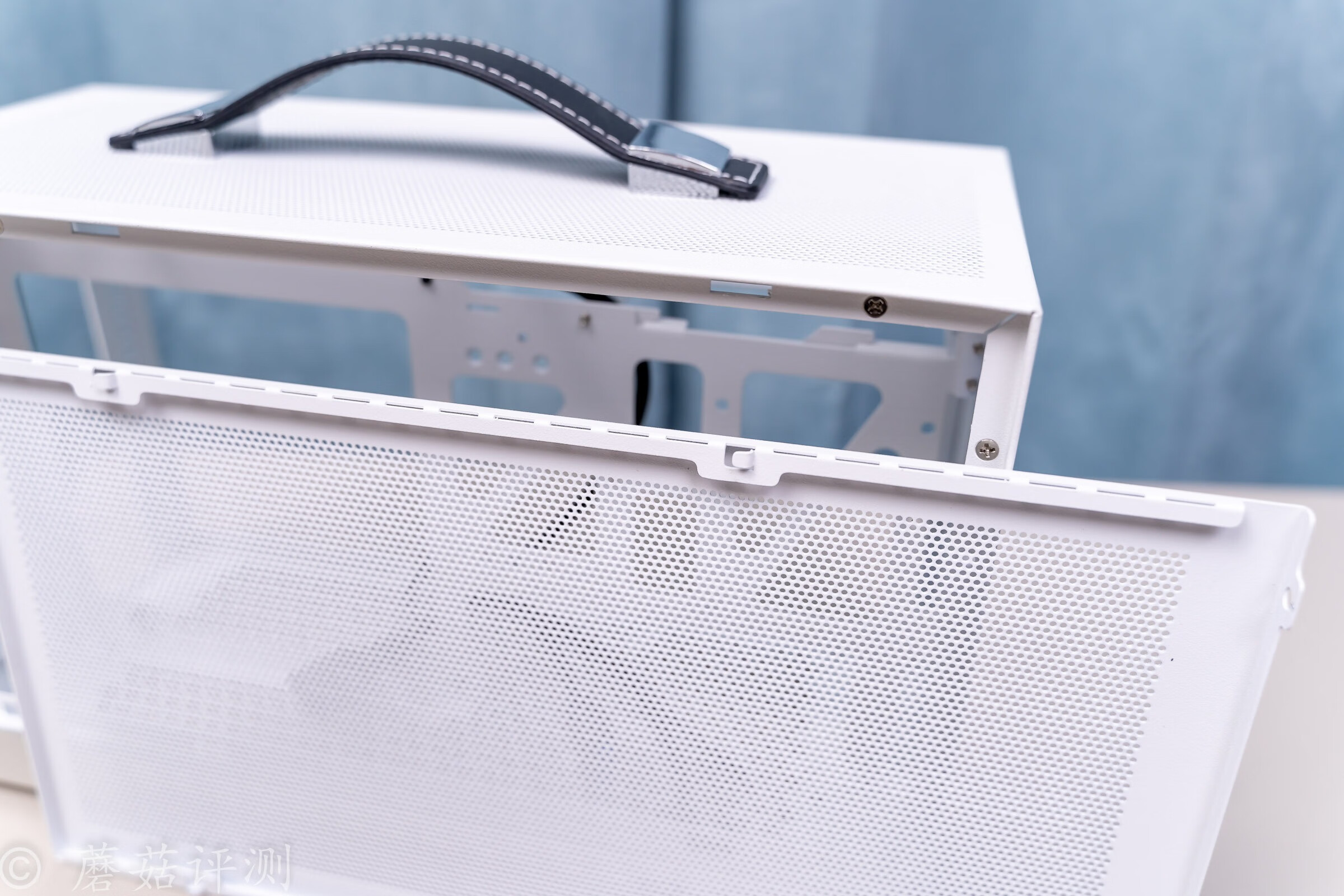 细节方面,机箱的前后挡板都采用了滑扣设计,日常可以非常轻松的固定的非常牢固,且有一定的前度,可以很好的保护机箱内部的硬件的同时,还很方便。真的是可以拎着机箱顶部的提手到处乱走的,只要你想。