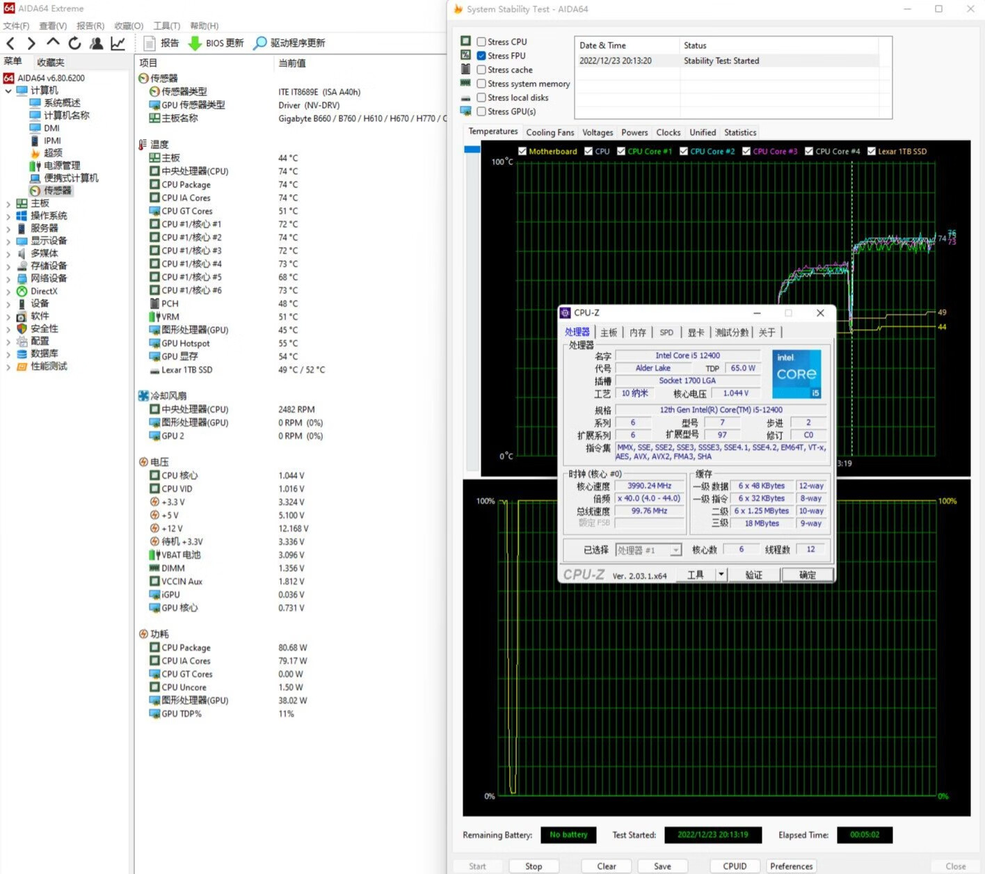 ▼单烤FPU测试,处理器功耗80W左右,全核心睿频4.0GHz,温度在74℃,南桥48℃,固态49℃。