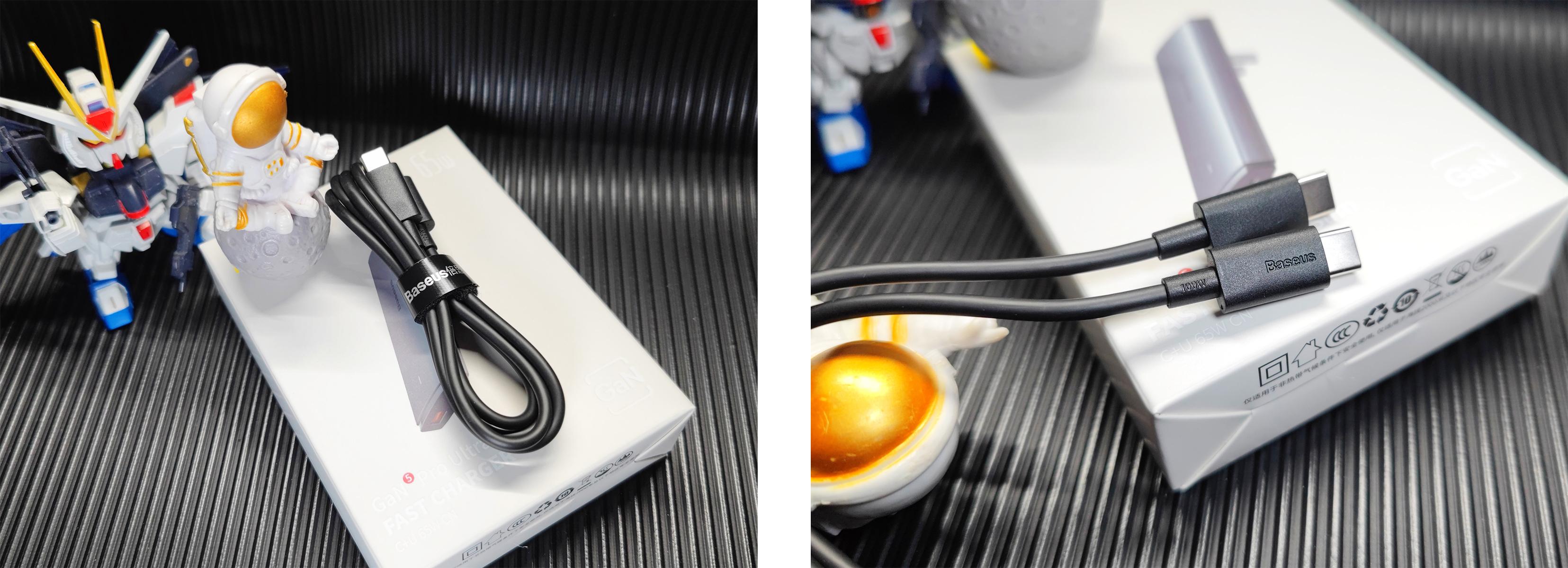 ▲ 倍思GaN5 Pro 附赠的 100W C-C 快充线 长度约为 1m ,还附带了 魔术贴细线带 ,非常贴心。线材采用了 TPE材质 ,耐磨耐用,支持 5A大电流快充 ,使用体验不错。