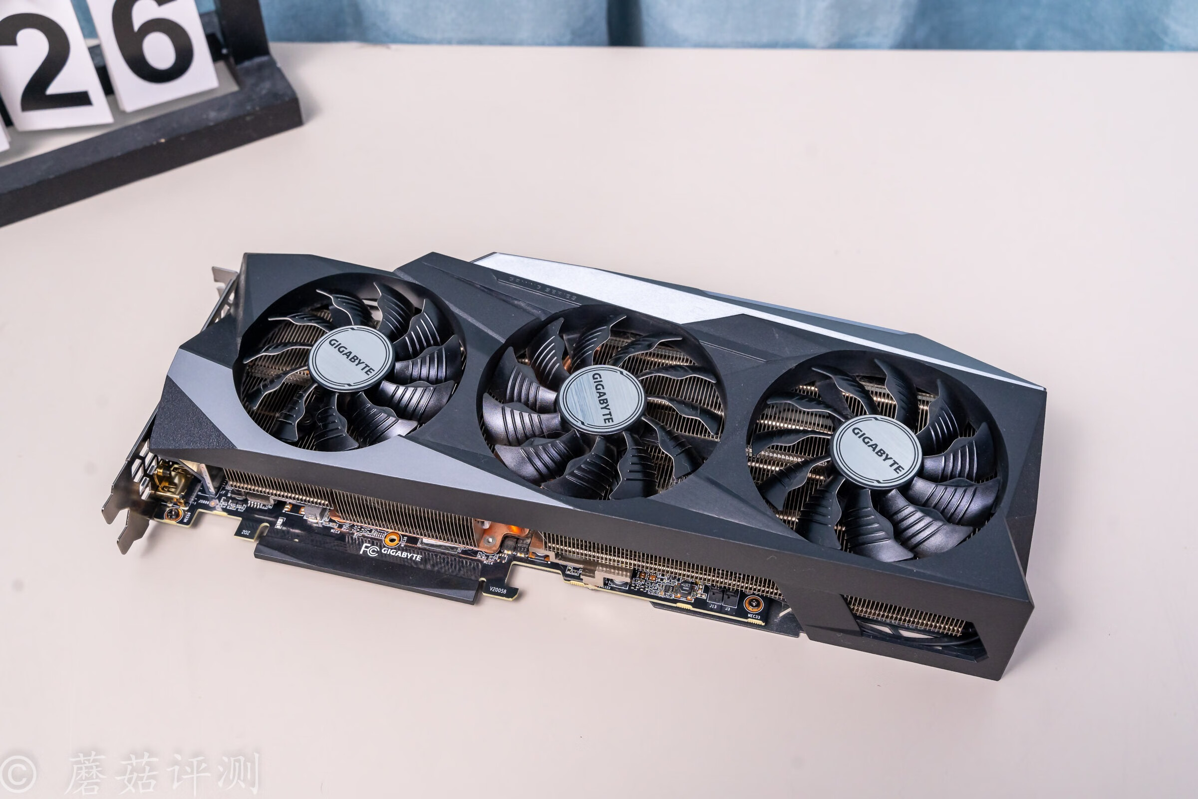 ▼显卡的外观很有辨识度,技嘉30系的魔鹰显卡外观基本都一样,正面是黑、灰配色的风扇罩,配合三把正反转的散热风扇。