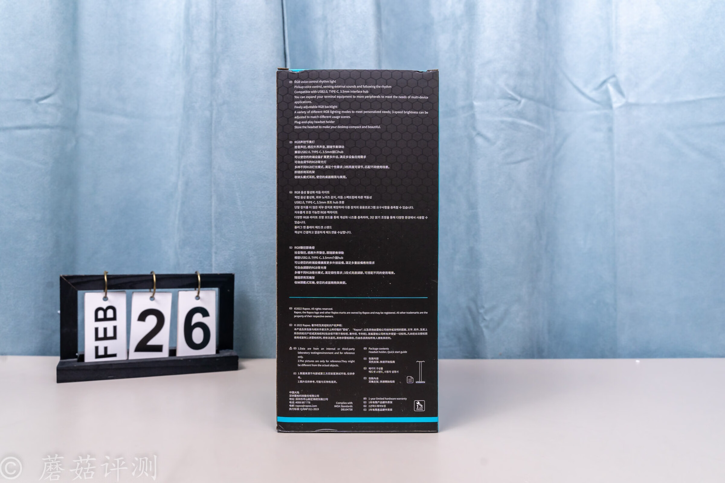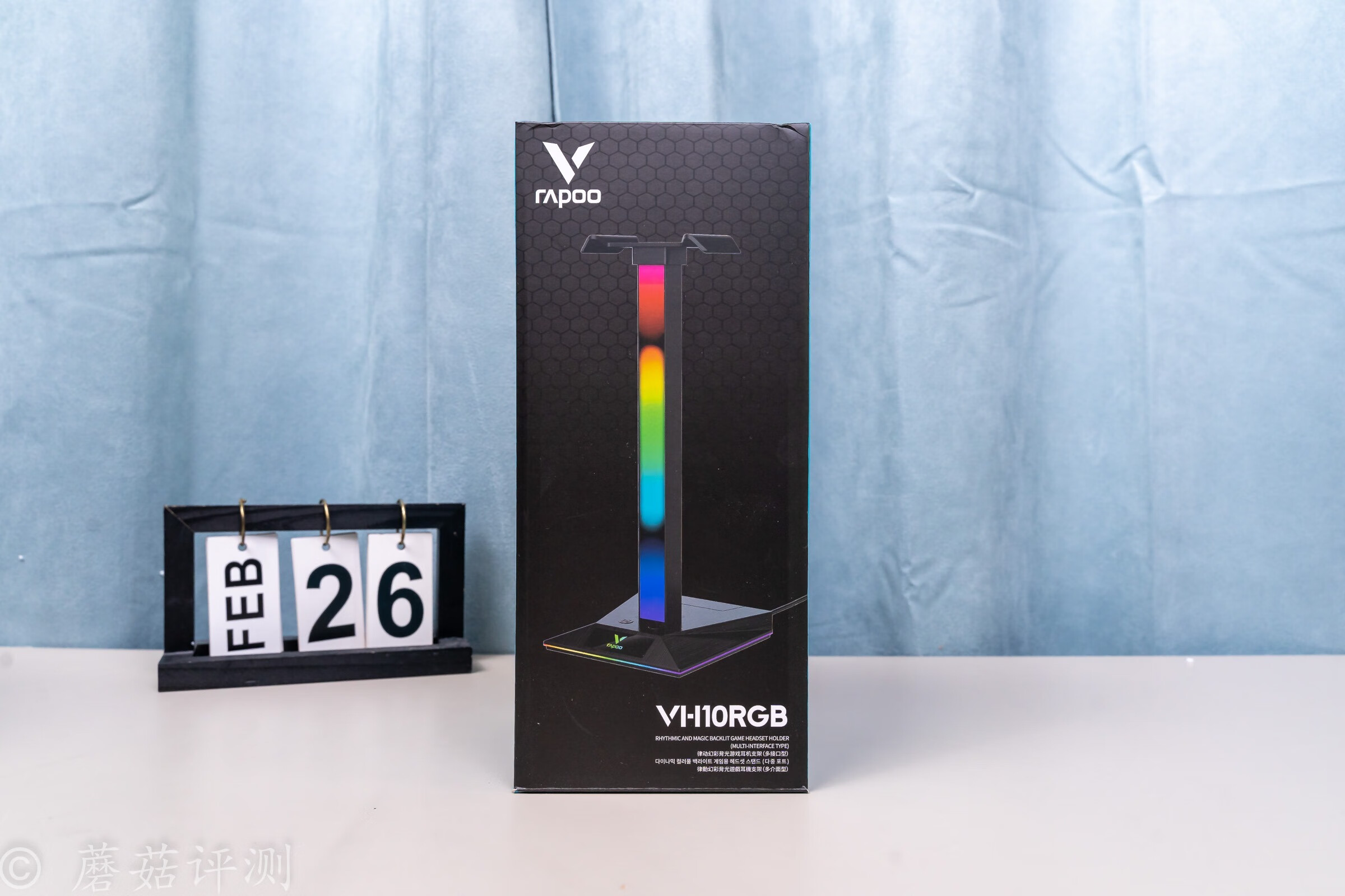 ▼雷柏VH10RGB耳机支架的包装盒也采用深黑色设计,正面中间有耳机架的彩印外观。