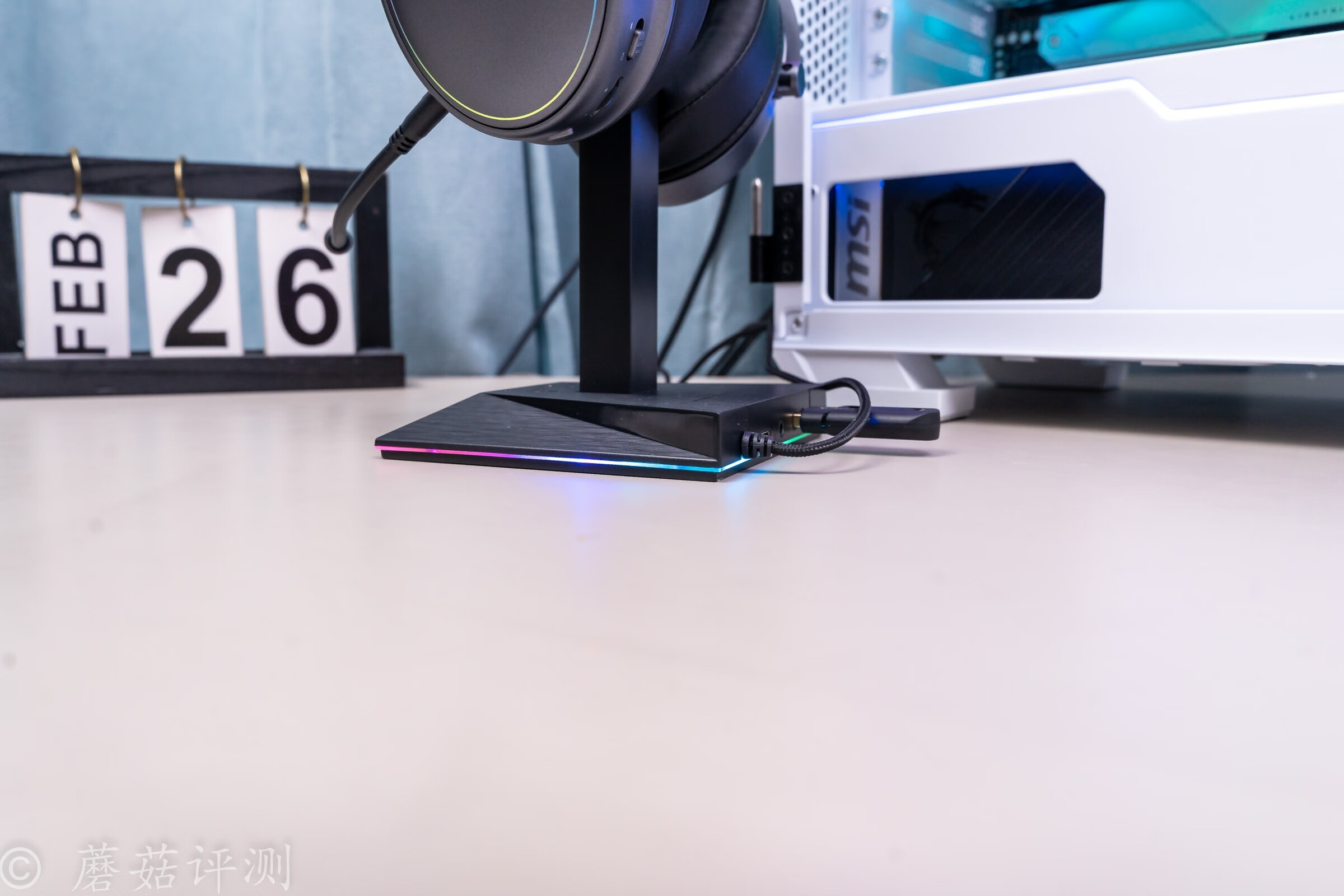 ▼耳机支架底座的四周有一圈RGB灯带,也非常漂亮。