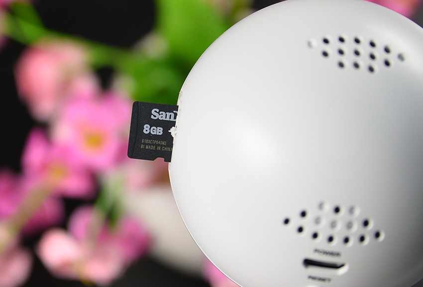 在鹏博士智能摄像头的侧面,有一个被封条贴起来的位置,这里就是TF卡的插槽,并且非常良心的随机附赠了一张闪迪8G的存储卡。因为目前鹏博士智能摄像头还未开通云存储功能,所以所有录制的监控视频基本都需要通过这张存储卡进行存储,用户也可以自行更换更大容量的卡,来存储更多的内容。