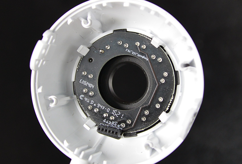 基本上整个摄像头的内部是由三部分组成的。前端的灯泡部分,中端的镜头和主板部分,后端的交互部分。