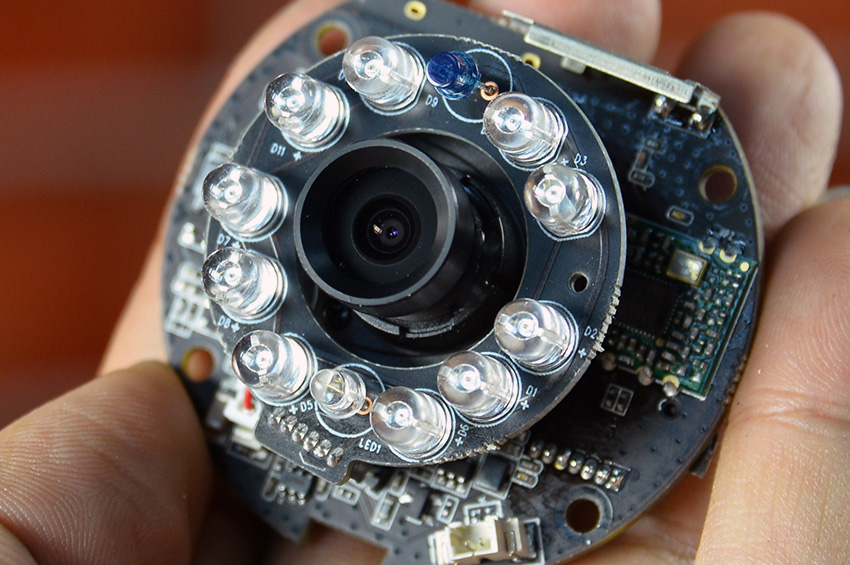前端的灯泡部分主要是夜视组件,红外灯泡数量很多,可以保证在漆黑的夜晚也能让摄像头拍摄出清晰的画面。