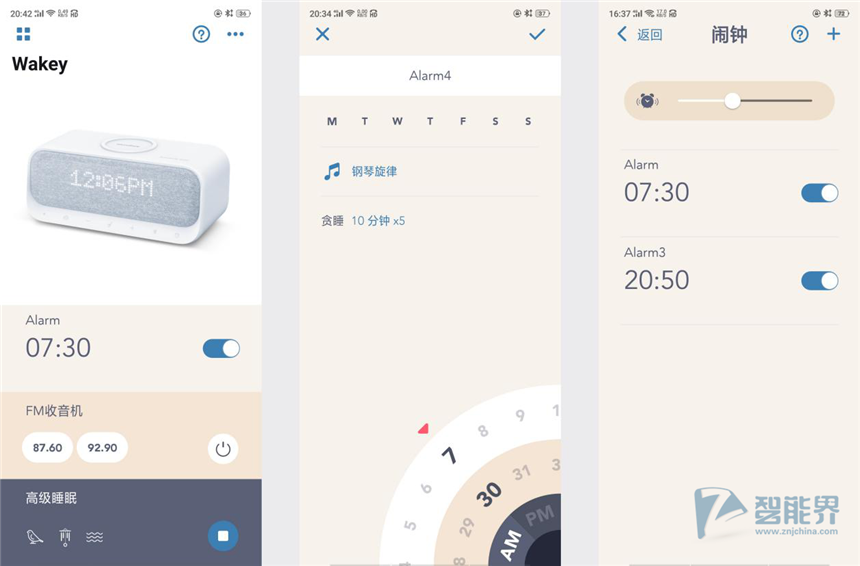 比如设定多个闹钟,每个可以有不同的铃声以及贪睡时间;FM电台频段搜索也更直观;高级睡眠模式的白噪音播放自定义更加自由和个性化。