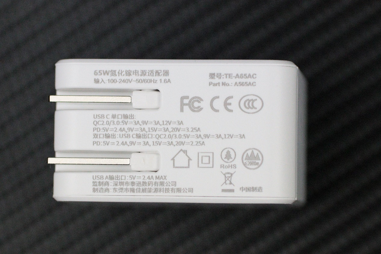 本次泰讯的这款氮化钾充电器我用的是双口的版本,双口同时最高可达65W的快充。无论是给手机还是给笔记本充电都毫无压力。因为我们日常使用的笔记本功率一般就是65W左右,所以用它充电非常的省事,还可以同时给手机充电,而且比一般原装的充电器的体积要小的多。