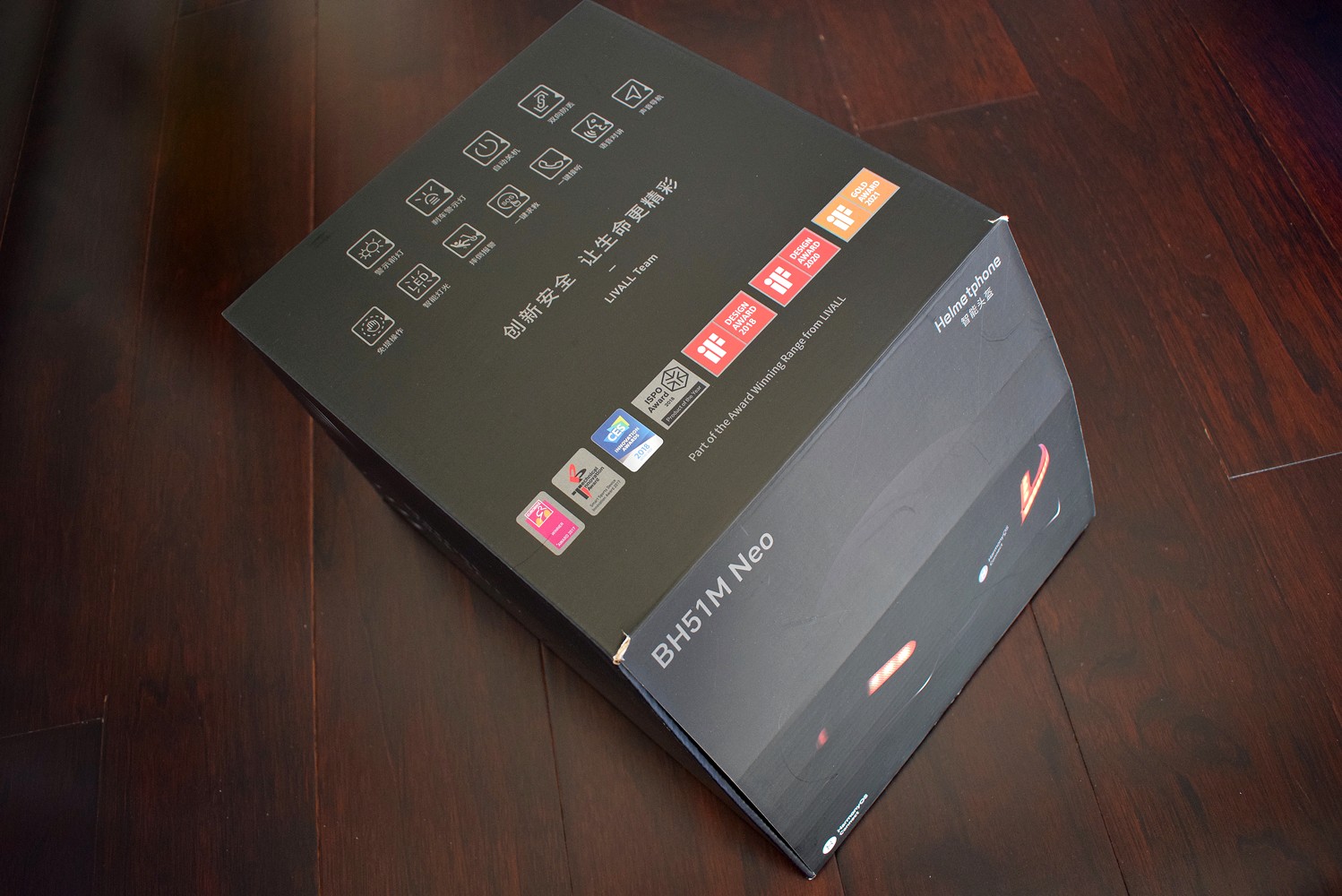 通过包装盒可以获悉品牌在国际上屡获大奖,同时能够了解到这款智能头盔的实力点,比如警示前灯、刹车警示灯、自动关机、双向防丢、免提操作、智能灯光、摔倒报警、一键求救、一键接听、语音对讲和声音导航等一系列智能化的安全及生活功能。