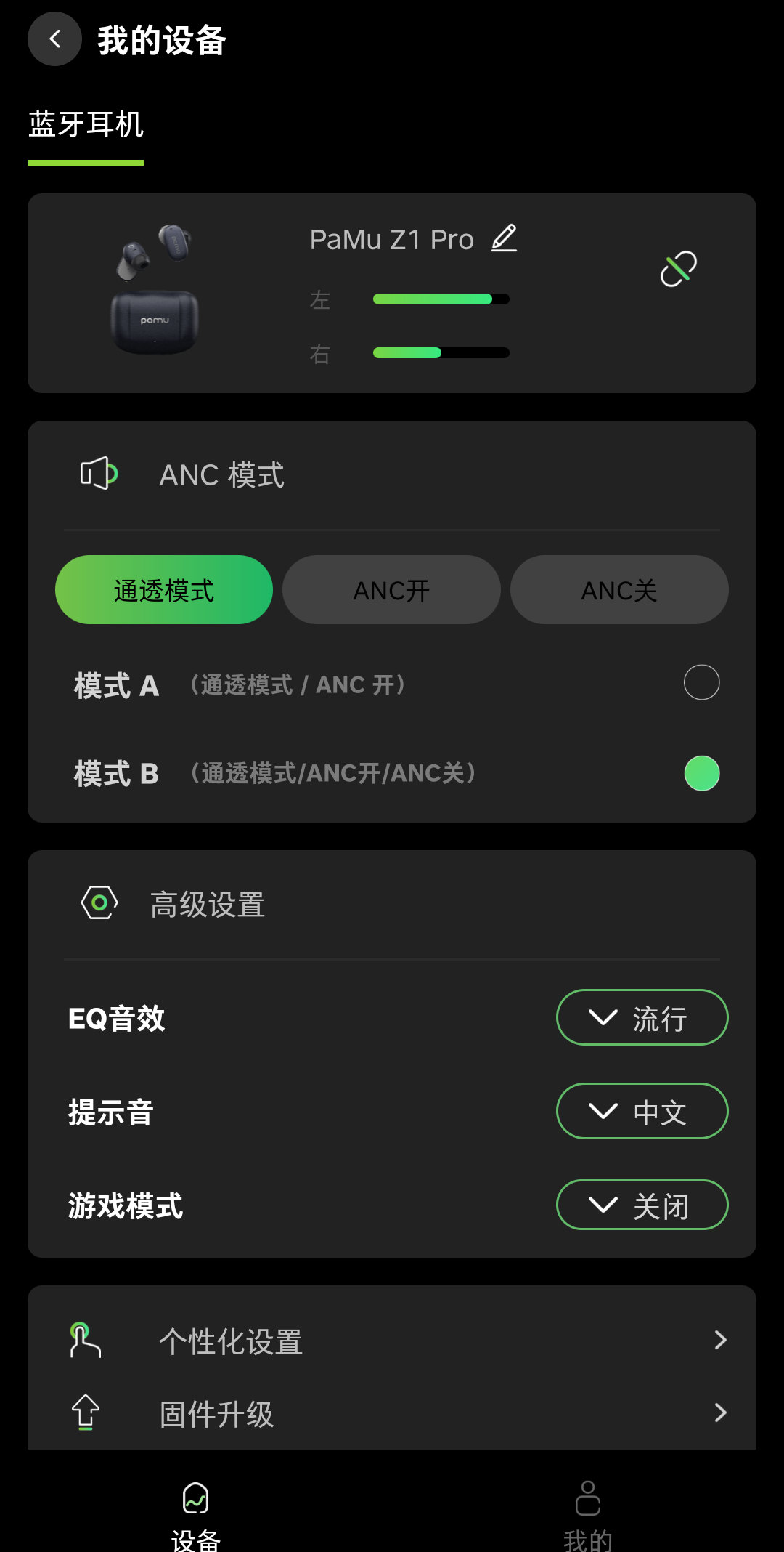 主动降噪设置了两个模式供用户选择,可以通过耳机触摸区操作,也可以在APP上直接切换,切换会有对应的语音提示。
