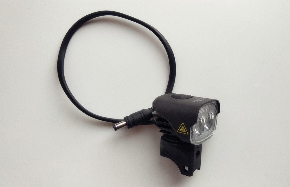 电池组另一侧是车灯和电池连接接头,拿下防护垫后将转接线与电池相连,从而和车灯连接。接通后线缆约80cm,足够各种安装情况。采用按压卡扣模式,连接很简单易操作。
