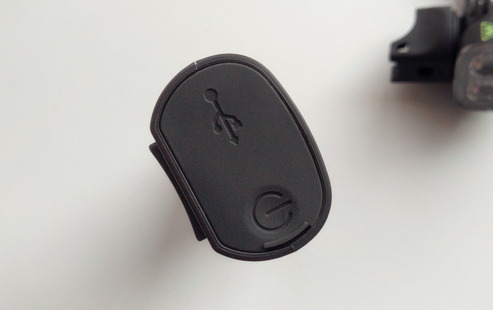 电池组一侧的橡胶防护垫下是电源开关、Micro-USB充电口、剩余电量指示灯、USB-A接口。电池组不仅可以给车灯供电,还可以当做充电宝给手机等数码产品进行充电。在骑行过程中遇到手机电量不足时,可以用它给手机充电,保证通讯畅通。通过电量指示灯可以很直观的了解剩余大致电量情况,合理规划骑行计划。
