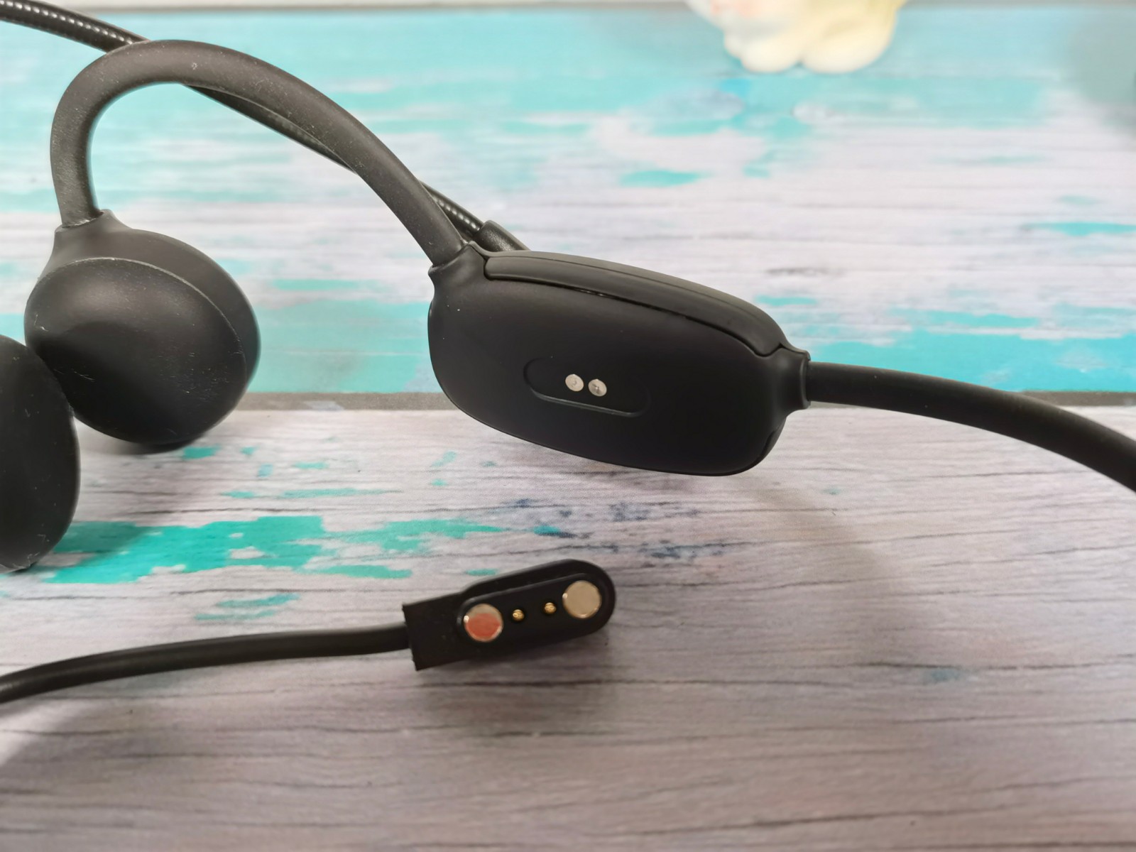 内侧面是两个磁吸式的金属触点,配合专用的磁吸充电线对耳机进行充电,由于磁铁极性的限制,磁吸触点和耳机靠近会自动正确吸附