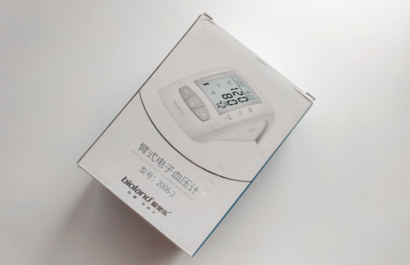 血压计外包装设计很简洁,此款为臂式电子血压计,包装正面可以看到血压计的具体型号,侧面是血压计的基本参数等信息。
