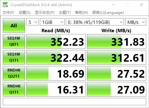 该软件实测顺序读取和写入的速度都在350MB/s左右,表现比较稳定,速度也比较亮眼。