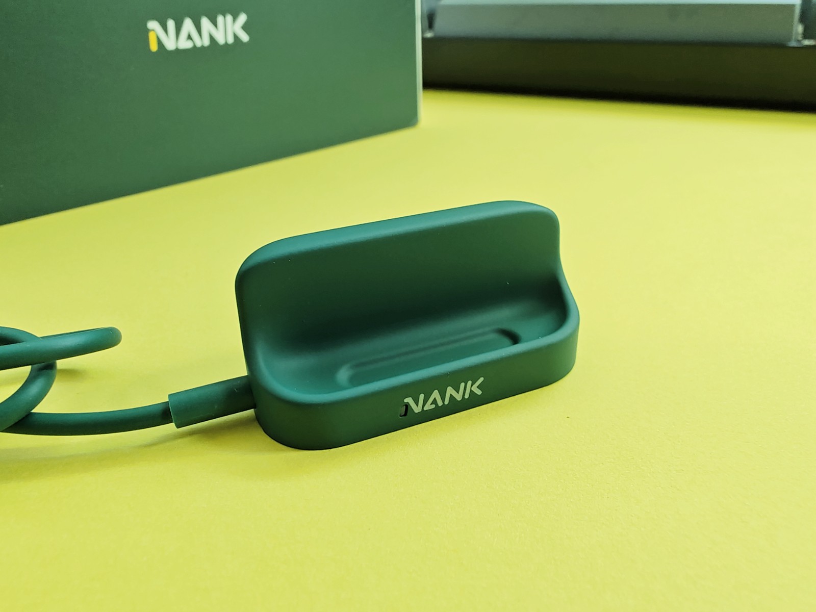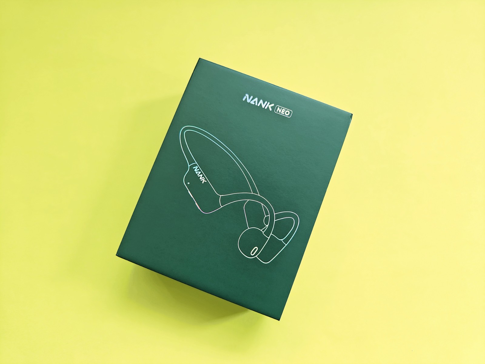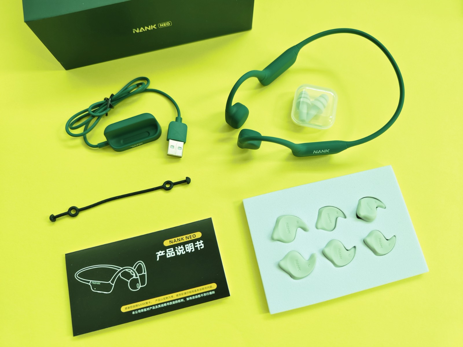 南卡NEO有朱砂红、瓦松绿、静谧灰三色款,红、灰两色南卡产品中已多次使用,绿色的印象中貌似是首次,所以选了此款。产品包装盒也是绿色配色为主,简洁而又大气,正面印有耳机的线条构图。作为骨传导耳机来说,南卡NEO配件相当丰富,三对音质增强耳塞、一条松紧调节绳、无线充电底座、一对隔音耳塞、说明书。