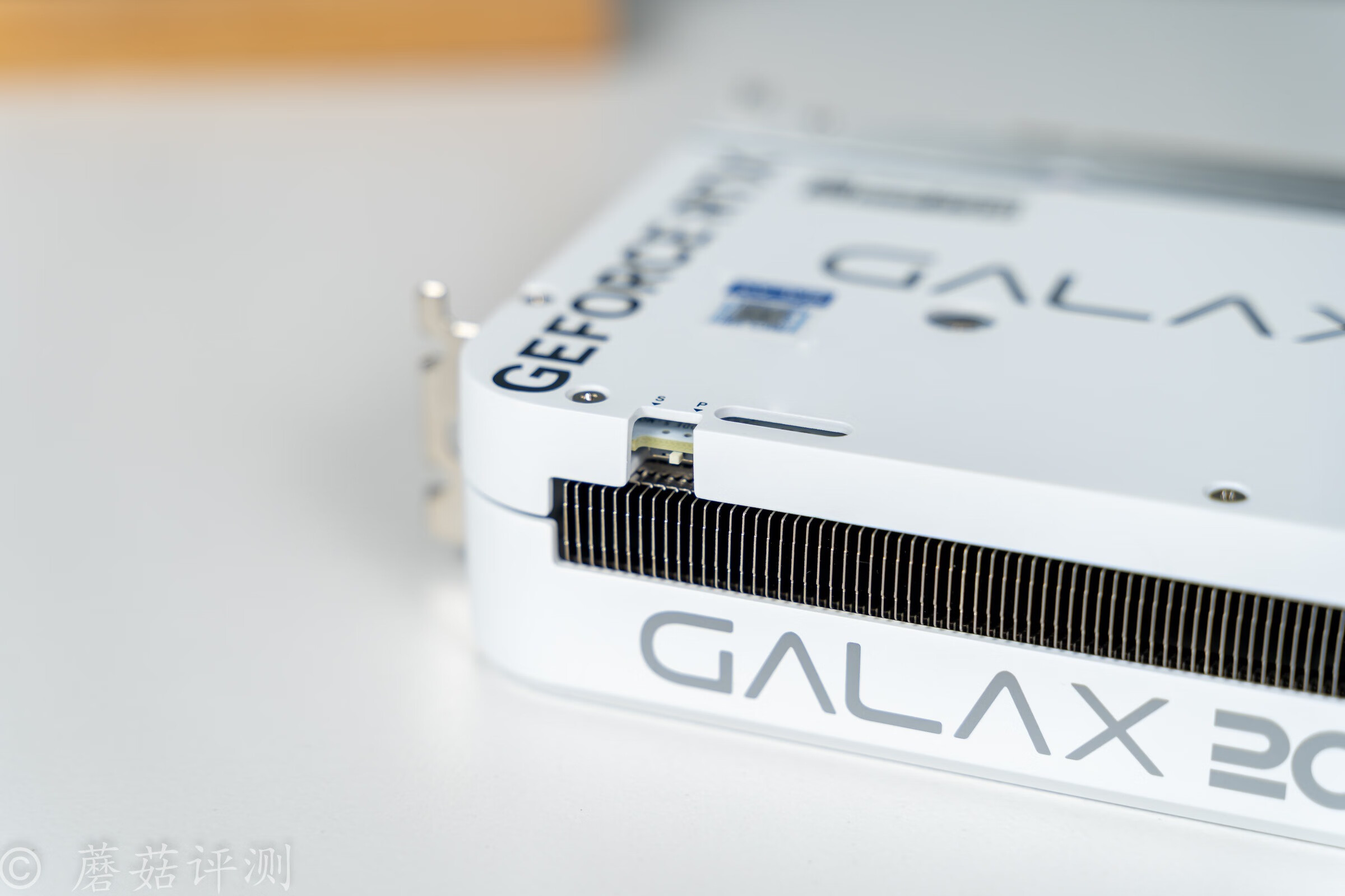 ▼白色的金属件,完整覆盖了显卡的PCB,可以有效的提高显卡整体的强度和寿命表现。另外在显卡PCIe接口的右侧,还有一个烫金的20th,也是纪念影驰20周年。