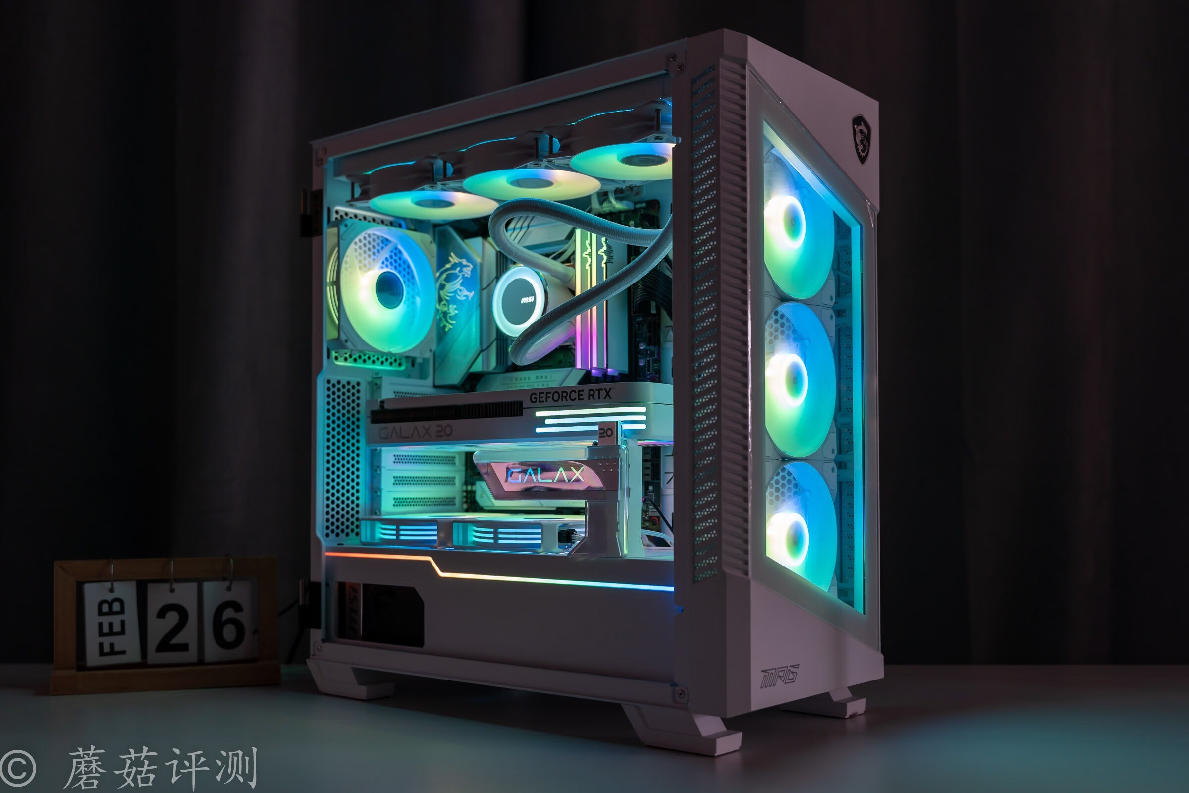 ▼机箱是微星的刀锋100R白色版,机箱的前部和侧面标配有大面积的玻璃侧透,可以更好的展示机箱内部的硬件。另外在机箱前部的玻璃内侧,标配有三把白色的、ARGB灯效的机箱风扇,搭配机箱前部玻璃侧透的整体效果不错。