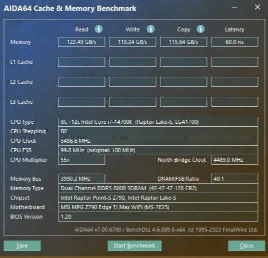 ▼优化时序之后,跑个读写测试,内存读取速度122.49GB/s、写入速度119.24GB/s、复制115.64GB/s,延迟60ns,整体的性能表现非常不错。