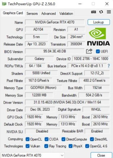 ▼显卡的GPU-Z,核心是AD104,流处理器5888,显存12GB,镁光的GDDR6X。