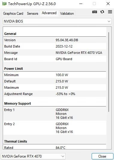 ▼简单的看下显卡的BIOS,最大功耗在215W左右。