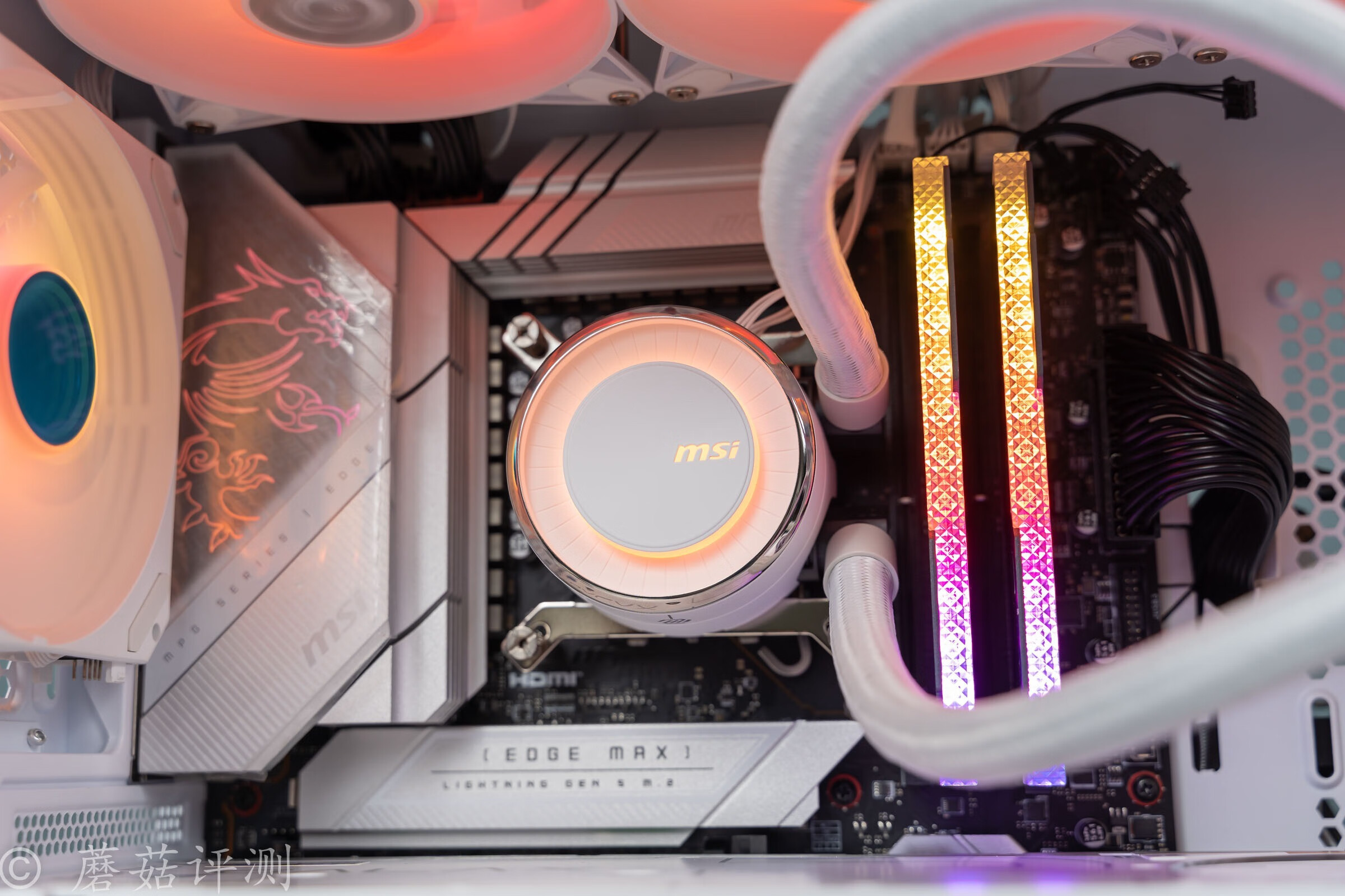 ▼用来压制14700K的水冷是微星的寒冰E360白色限定版,这款水冷的水冷头设计非常用心,铜制底座搭配高密度微水道,再辅以双腔结构设计,可以快速带走处理器的热量,让处理器稳定运行。