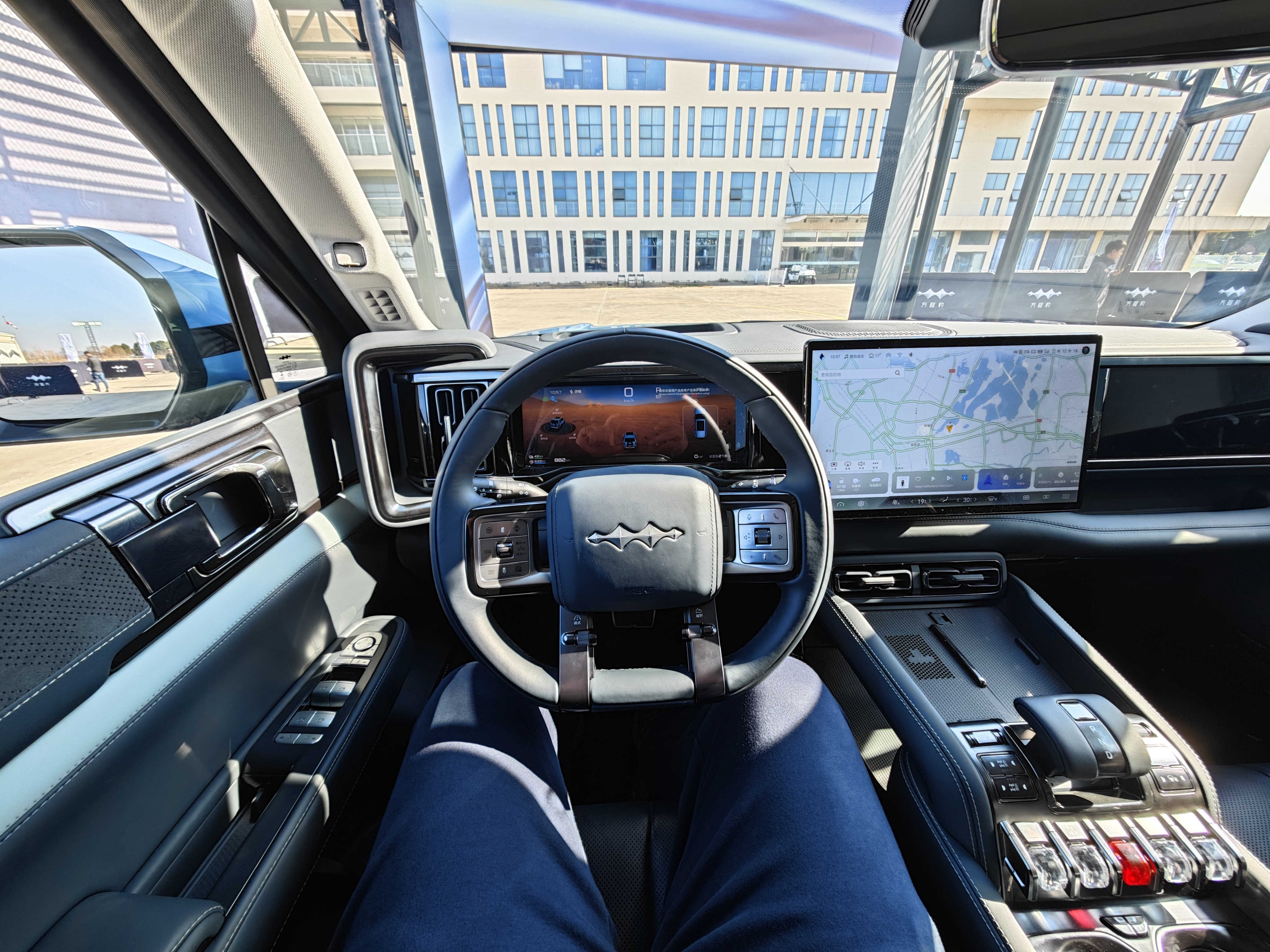 ▼车辆的方向盘非常的大,握感饱满。两侧是多功能控制按键,底部是越野模式选择,日常操作很方便。
