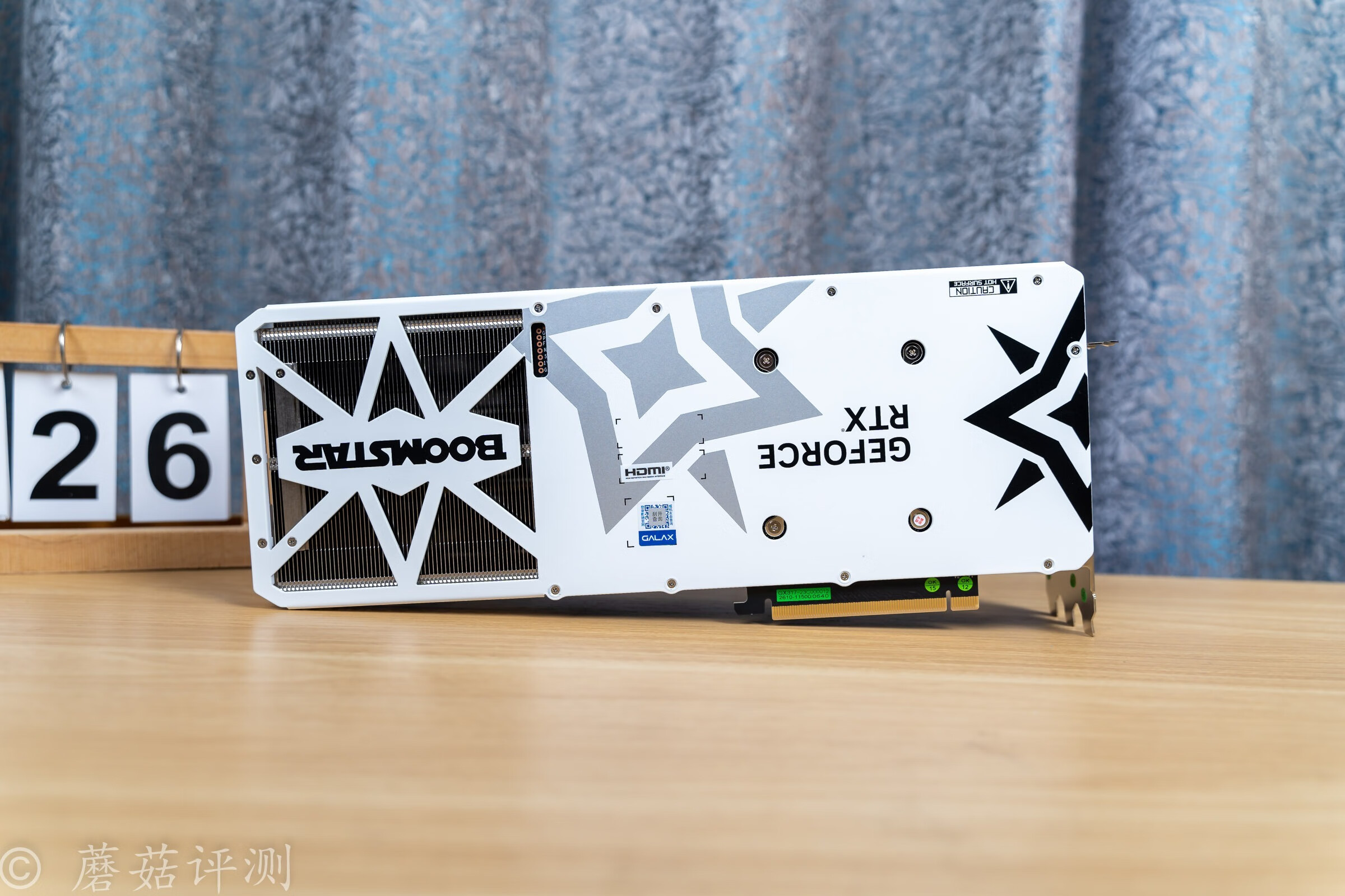 ▼显卡默认的金属背板质感很好,上面的涂装很精致,采用了黑白灰的配色,搭配白色主题的主机效果很棒。