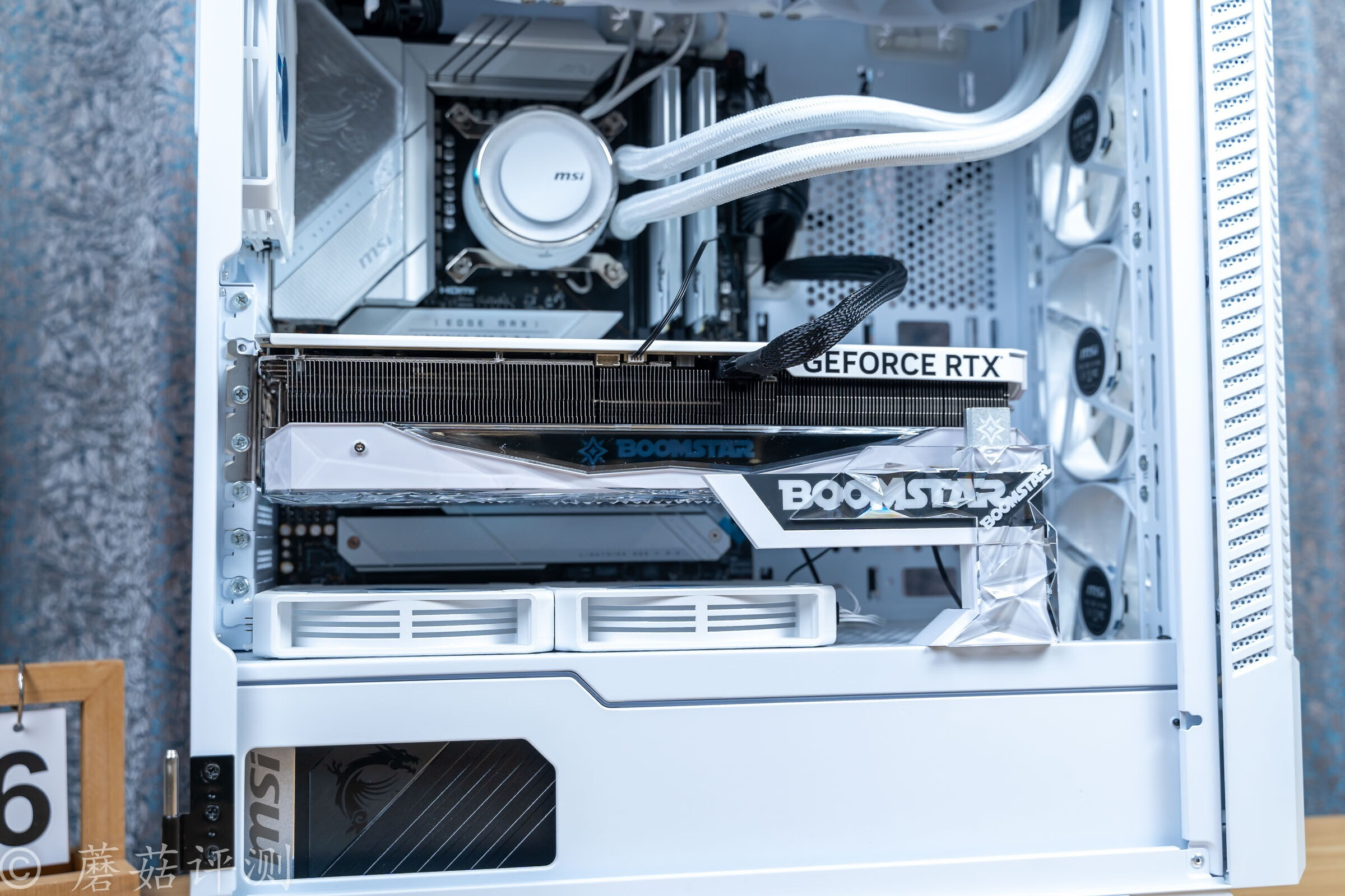 ▼显卡默认水平安装,并在显卡的尾部撑一个显卡标配的显卡支架,让显卡整体保持水平。水平安装的情况下,感觉显卡底部的空间很紧凑,虽然微星的这款刀锋100R机箱是ATX规格的,但应付3.5槽的显卡,同时在电源仓上部安装机箱风扇,会感觉有点空间紧凑。
