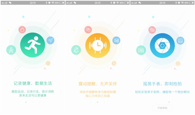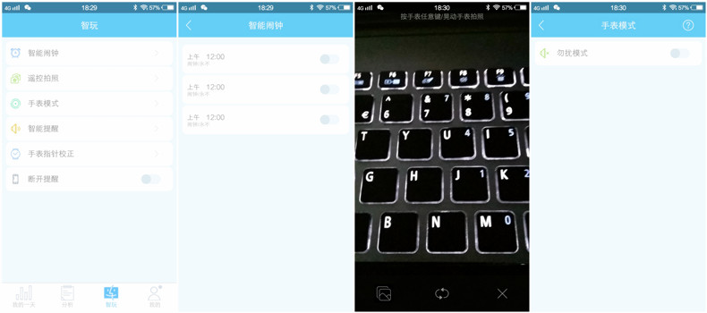 智玩界面整合了飓风199智能手表所有的智能化操控设置,在此界面我们可以实现闹钟设置,遥控拍照,智能提醒 ,指针校正等手表智能化操控。闹钟设置对于上班一族还是十分实用的,轻柔唤醒。通过手表还可以实现遥控拍照功能,从而使得自己拍照不再是大头照了。智能提醒方面,飓风199智能手表可以实现通话,信息以及应用信息提醒,同时加入了久坐提醒功能,更好的保证健康。因为手表表冠不提供调时功能,手表的时间调整可以通过APP实现,并且作为网络时间更加准确,使用也更加便捷。