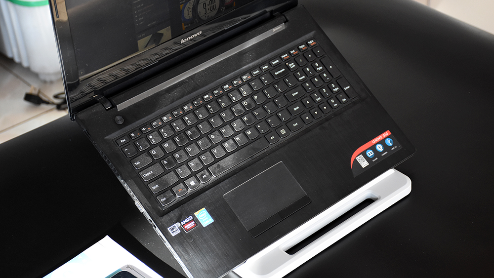在使用时需要将支撑板撑起来,支撑板上设计有四个防滑脚垫,与笔记本的D面接触增加阻力起到防滑的作用。笔记本C面与D面的交界处正好于支架底座前方凸起的阻挡条相抵,可以起到固定的作用。在实际测试中,笔者以联想G50-80(15''笔记本)为样本机型,放置非常稳固。