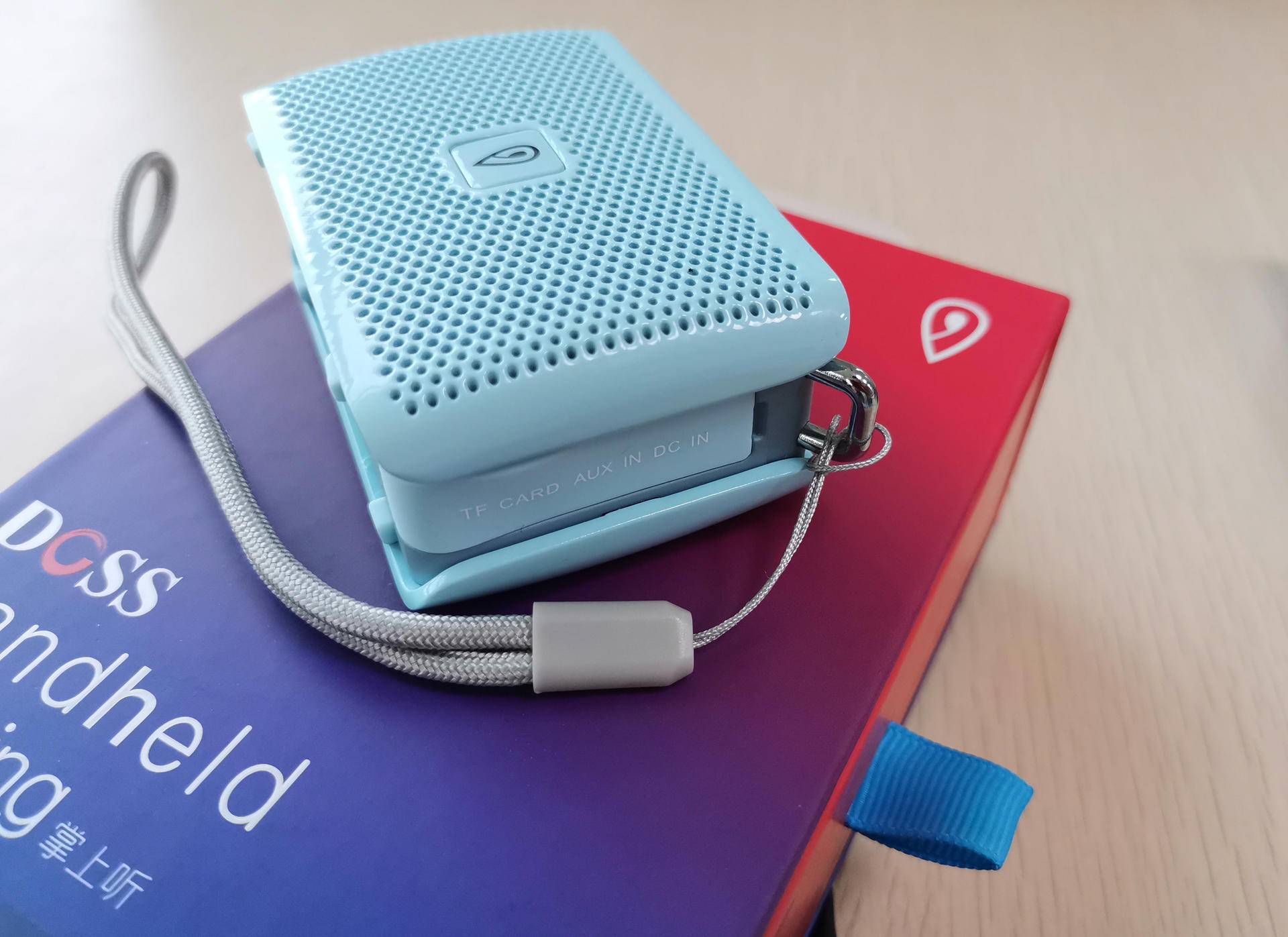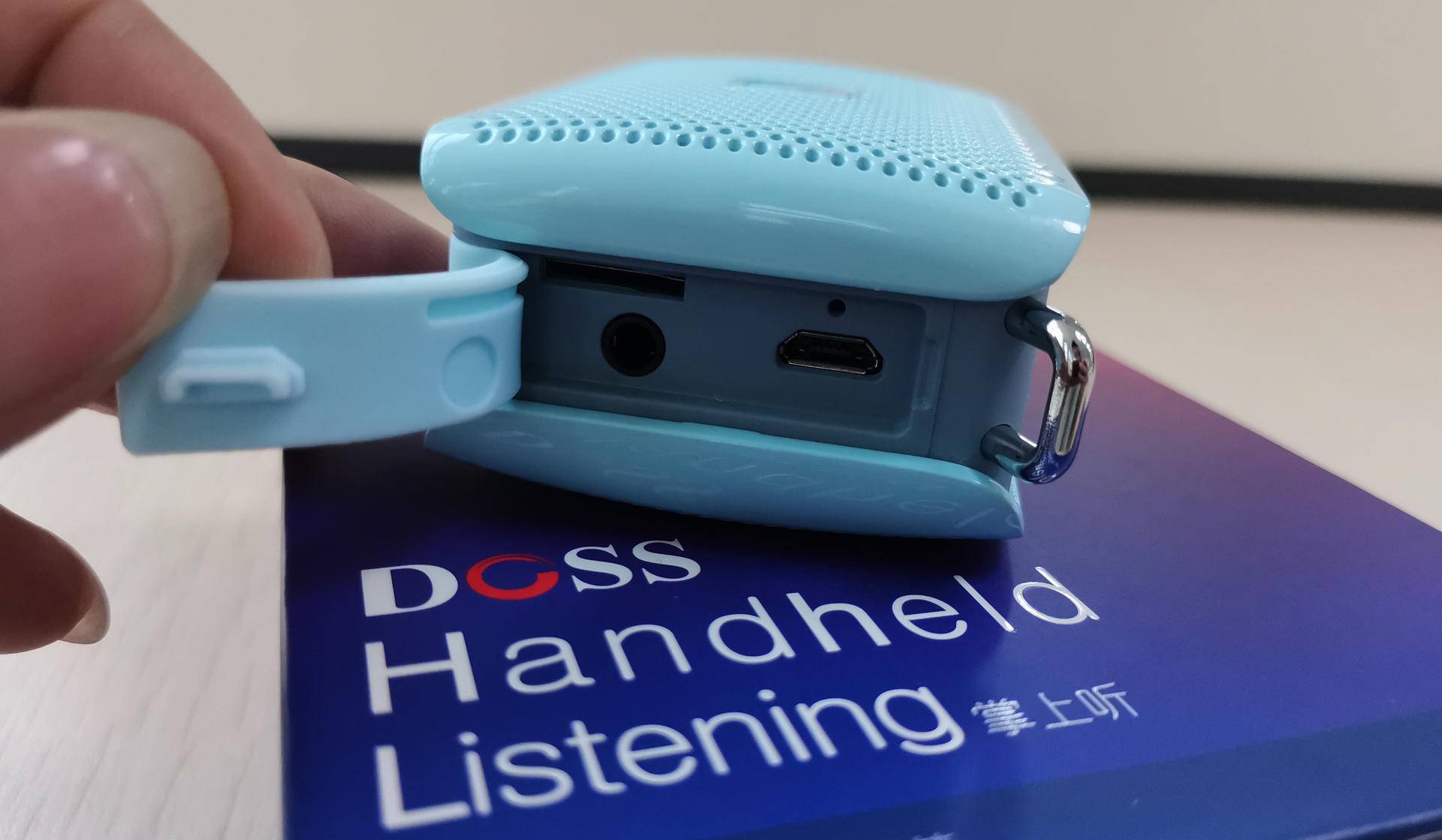 DOSS掌上听侧面采用硅胶封口,揭开硅胶封口,可看到AUX输入口、TF卡插槽以及Mrico USB充电接口。侧面伴有一个小挂钩,外出游玩或休闲聚会时,除了挂在背包上,还可以系上长绳吊在胸前,更显得舒适方便,时髦又百搭。