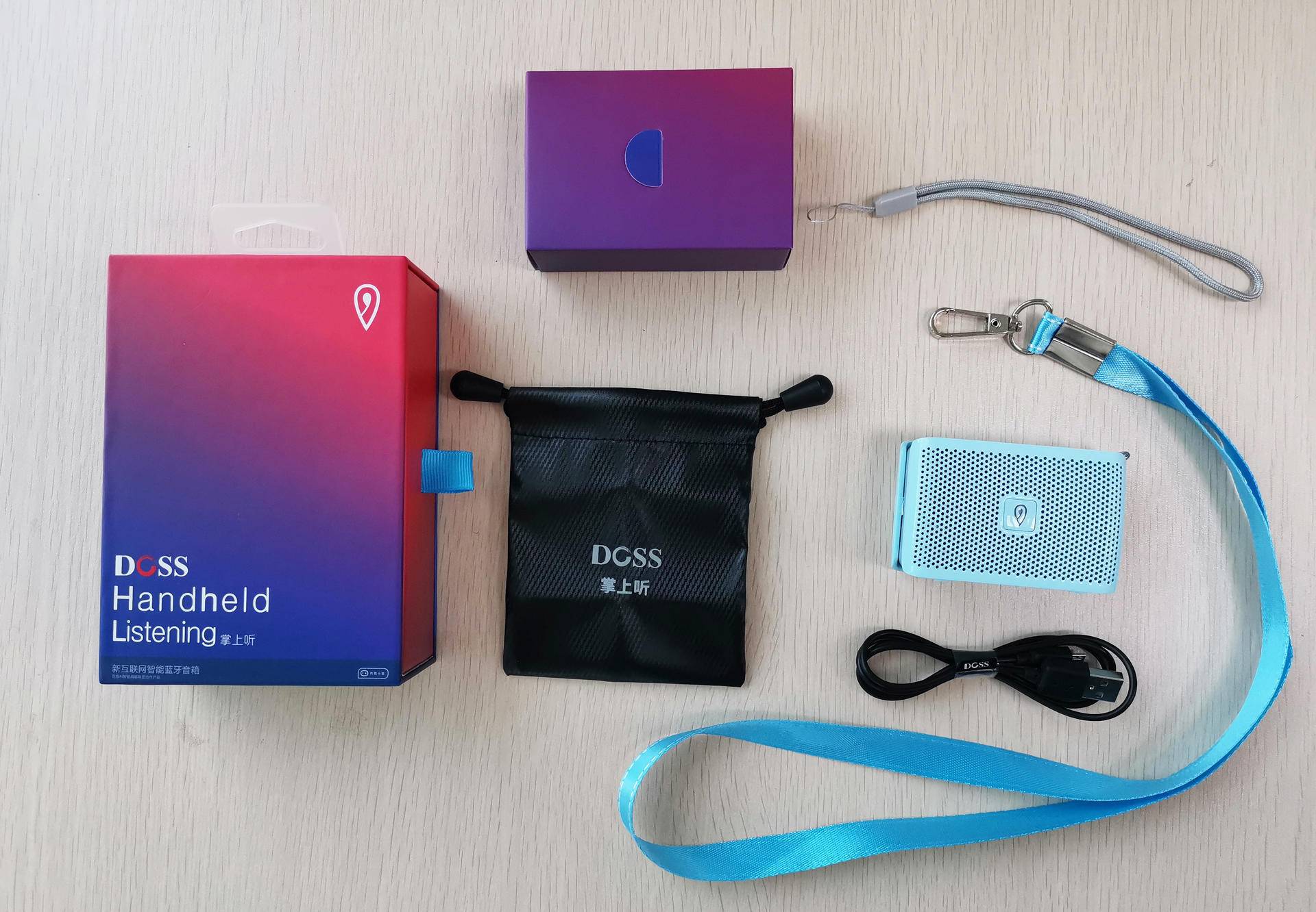 DOSS掌上听整体清单也非常简单,两根挂绳、1个保护袋,以及一根Mrico USB充电线。