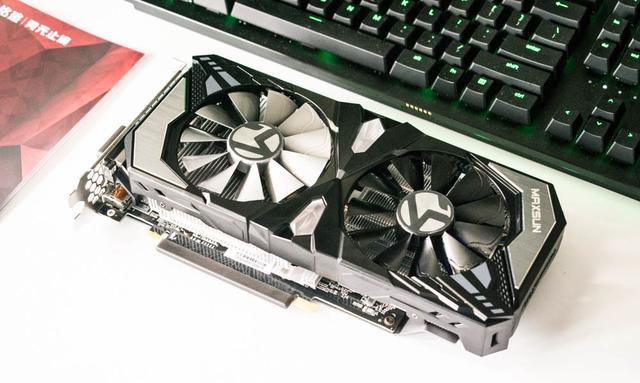 取出显卡,这款RTX2060 Super是2风扇的,依旧是铭瑄习惯的太极一黑一白风格。不过看着风扇,的确还是同一方向的,黑白之间可以看见有2个白色的,疑似是氛围灯。