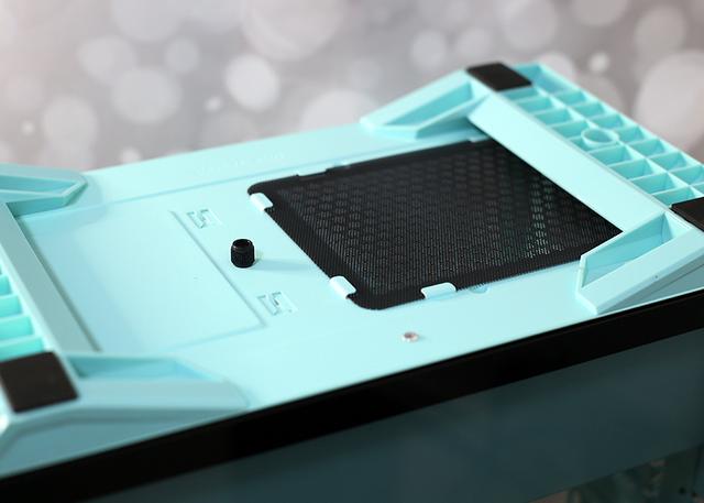 底部细节,可以看到机箱电源进风口位置搭配了快速拆卸防尘网设计,方便拿取和清洗。