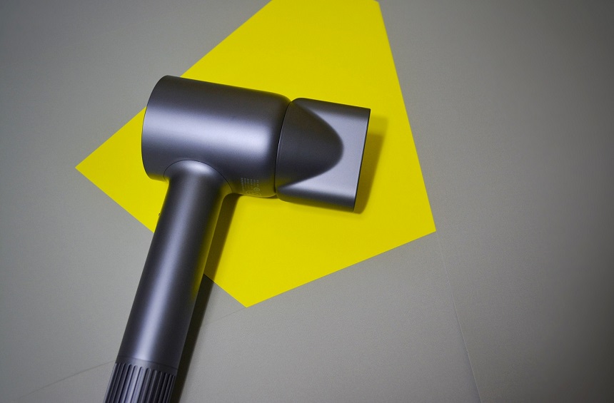 从侧面看也同样惊艳,相较于普通的吹风机,直白的机头很短,尤其是不加扁头吹嘴的时候造型好像一枚小榔头。